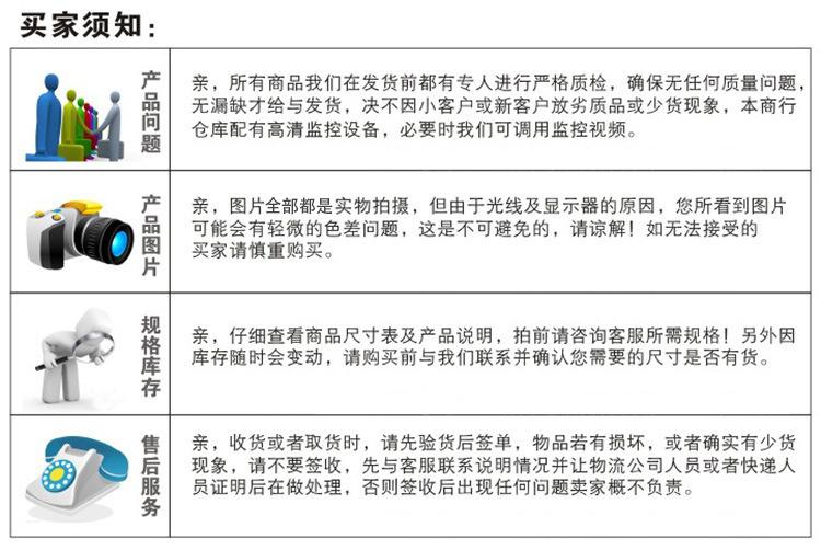 ◆ Estimados amigos, por favor, revisen la mercancía en persona y cuenten la cantidad al recibir el correo electrónico. Luego, firmen tras comprobar que sea correcta. Si observan daños al desembalar, discrepancias en la cantidad, daños, etc., no firmen la recepción y contacten con el vendedor a tiempo. Les daré una respuesta satisfactoria. Si se detectan los problemas mencionados después de firmar la recepción, el transportista no se responsabilizará y el vendedor no tendrá que hacer nada. ¡Recuerden! Para proteger los derechos de los compradores, nuestra tienda acepta Alipay, transferencias bancarias en línea y remesas.