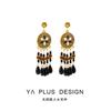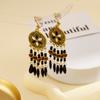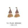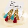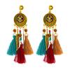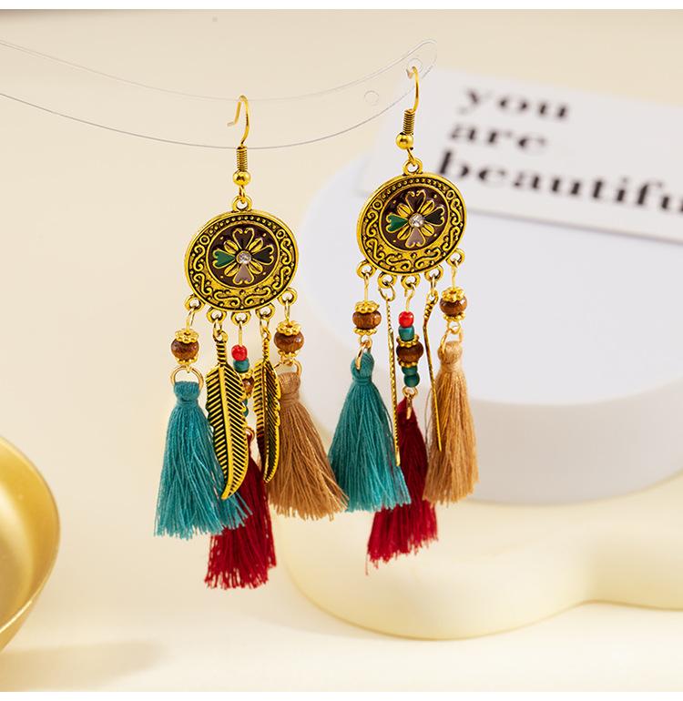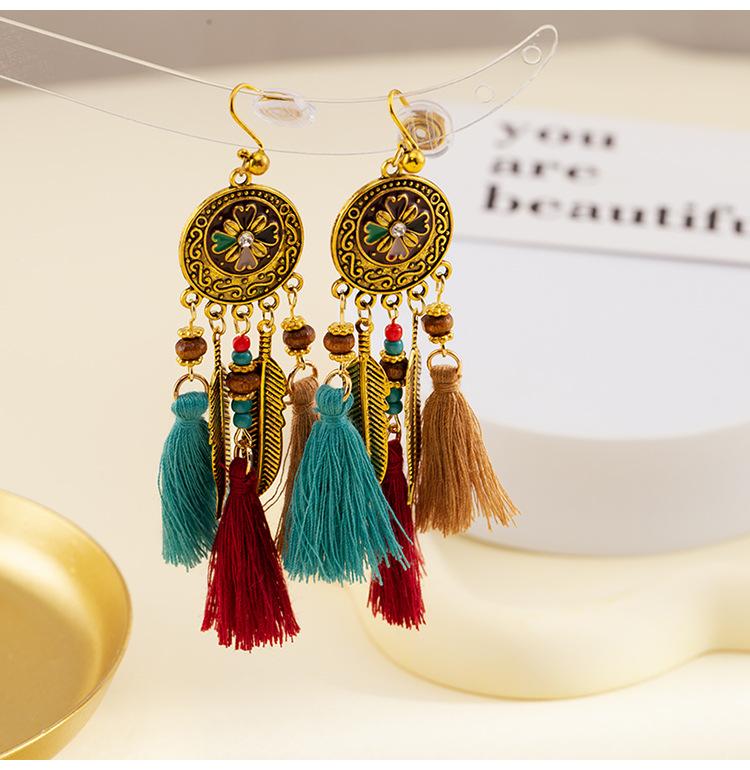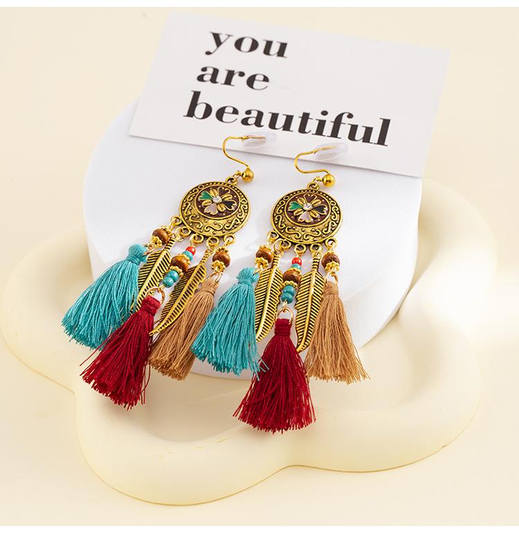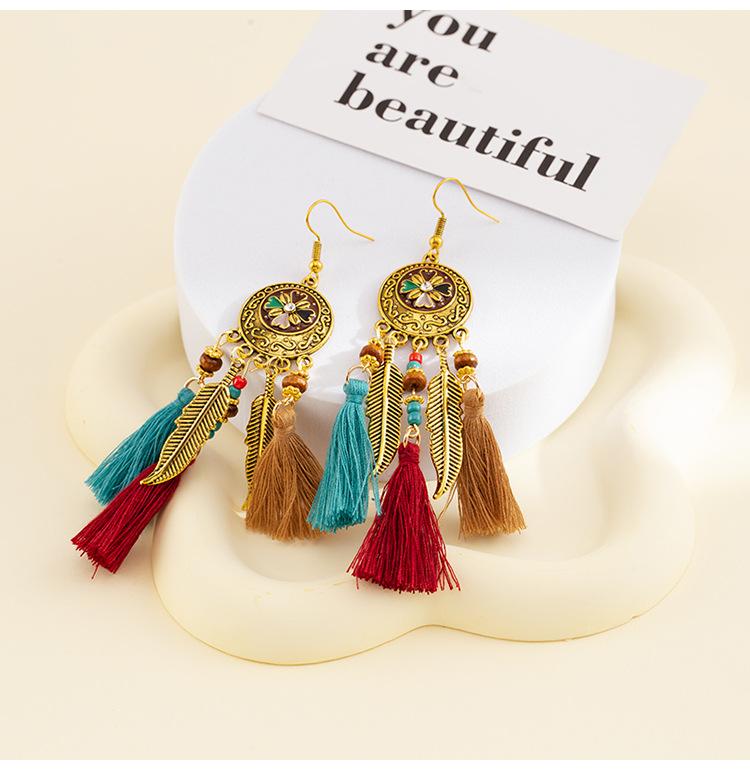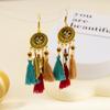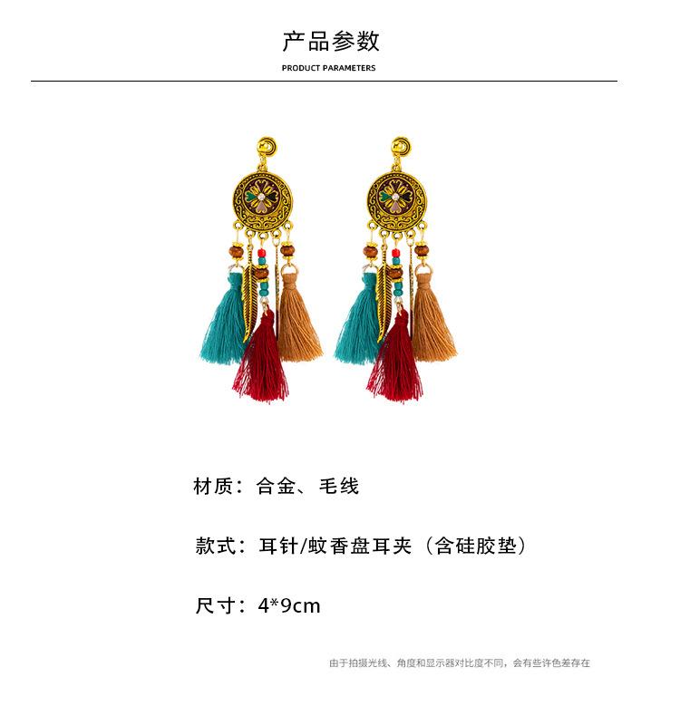 Pendientes de estilo étnico bohemio con borlas de lana de colores retro y hojas largas con espiral antimosquitos, clip para la oreja sin perforaciones para mujer