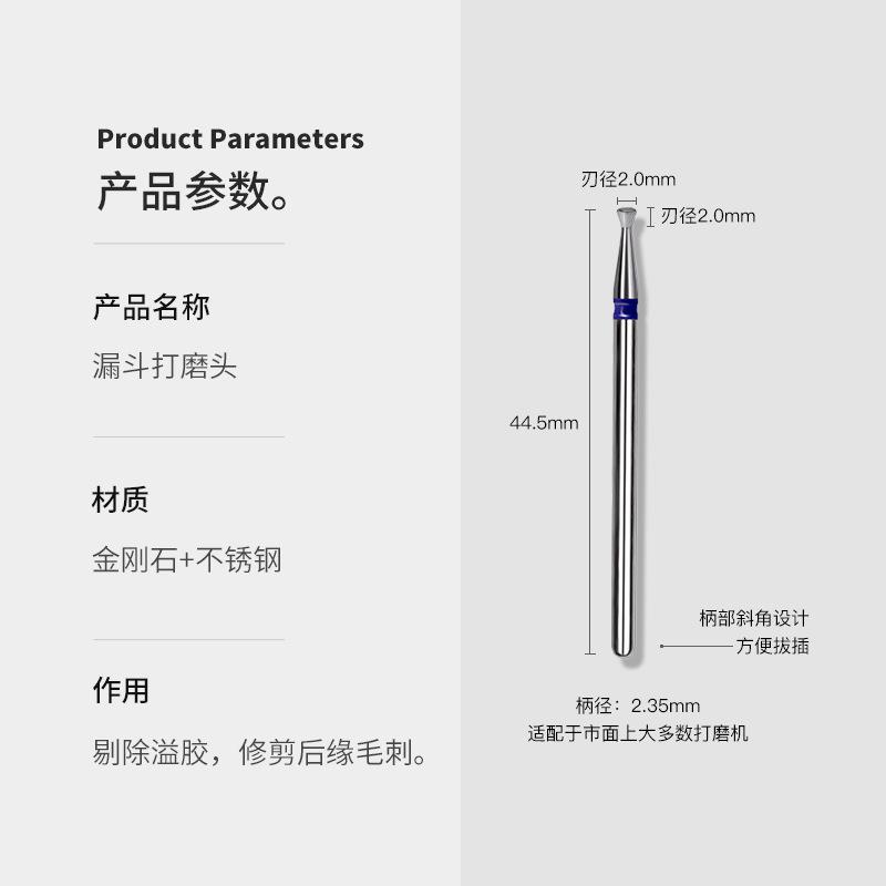 Mini cabezal de pulido en forma de embudo con cono de diamante para eliminar ambos lados del pegamento derramado, recortando el borde de la piel muerta con púas.