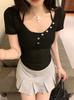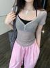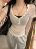 Camiseta de manga corta fina con cuello en V puro para mujer, nueva camiseta de verano sexy ajustada y adelgazante, top corto con hombros descubiertos
