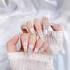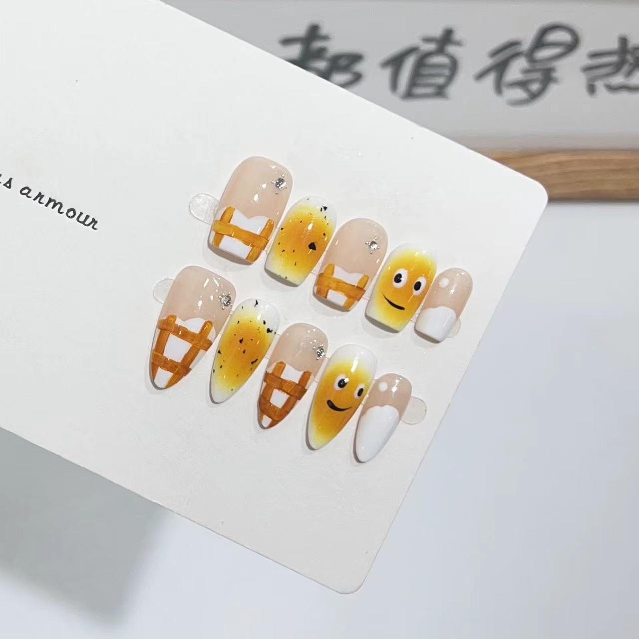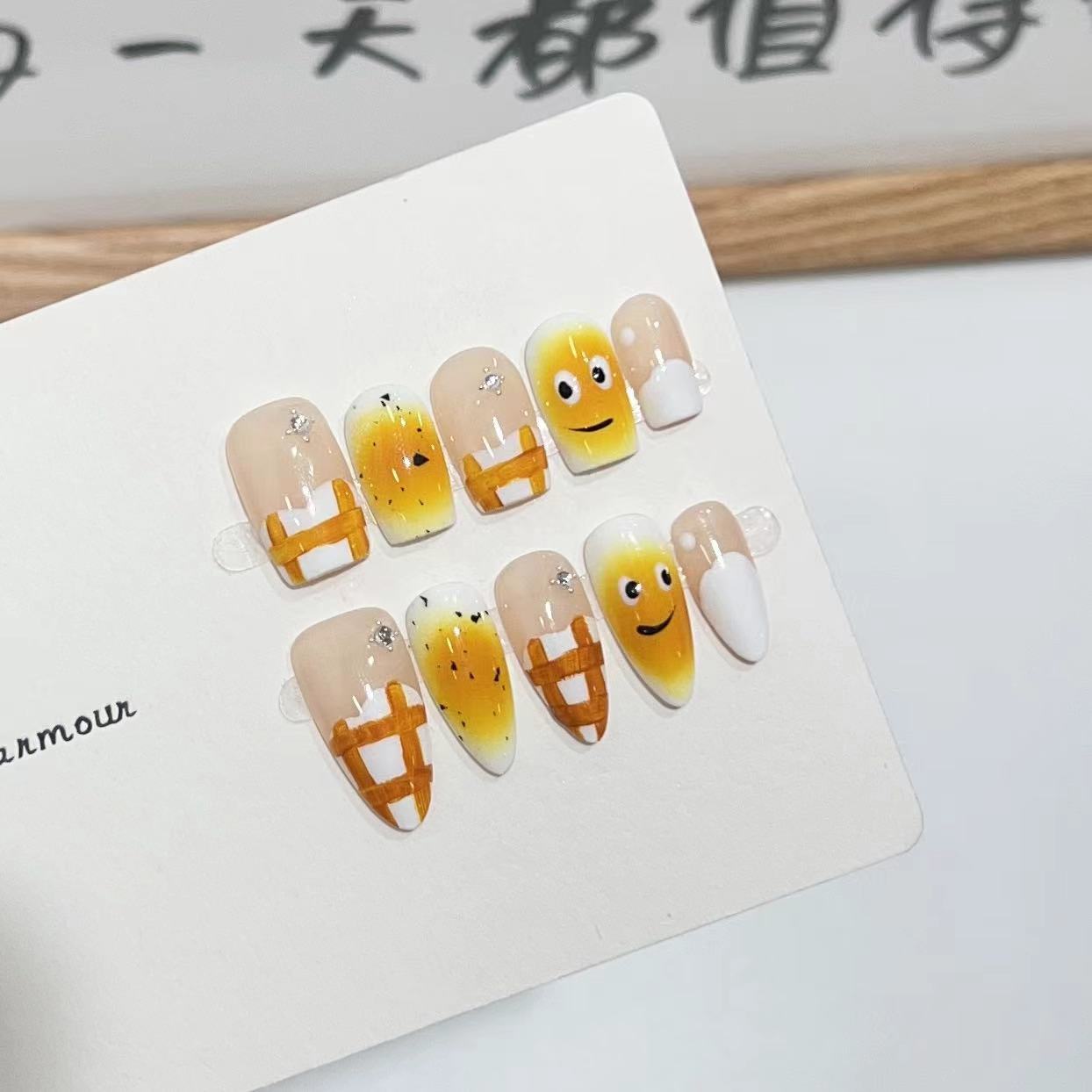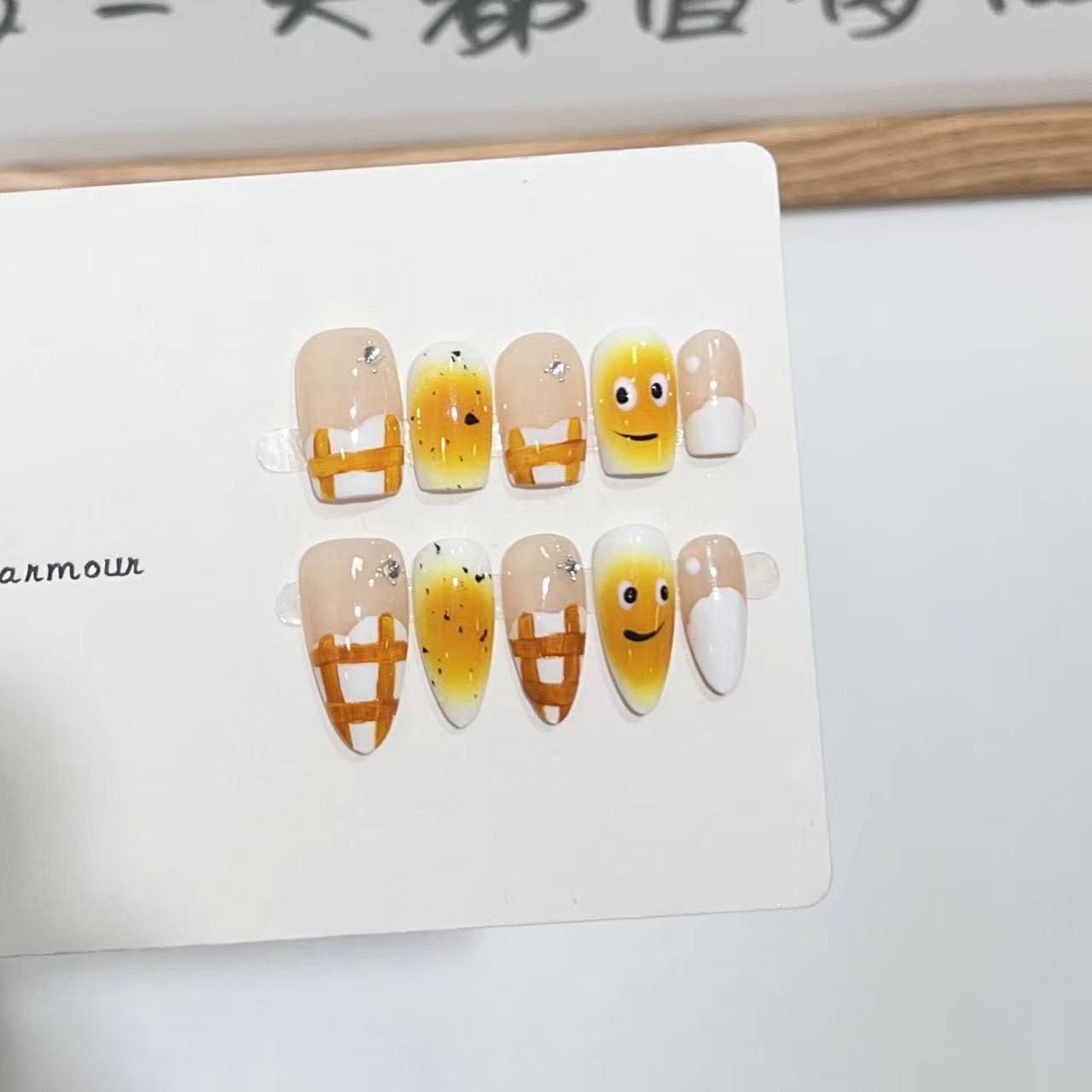 Armadura pura usada a mano con un lindo tesoro de huevo, arte de uñas pintado a mano francés terminado, parche de uña postiza removible al por mayor