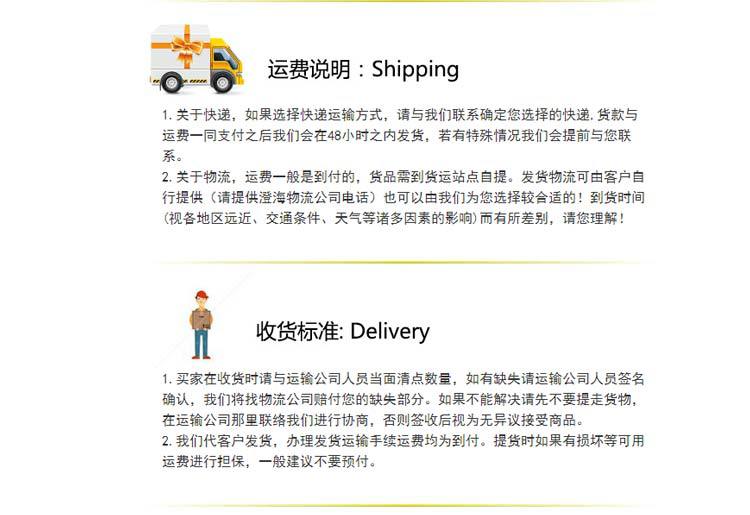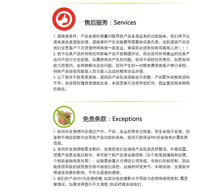 2. El juguete fue aplastado por el mensajero, pero usted firmó por él. Debe saber que el mensajero no será responsable después de la firma. En este momento, usted viene a nosotros y dice que las cosas están rotas, y no tenemos forma de reclamar una compensación al mensajero. Si se nos pide que asumamos no solo el flete de ida y vuelta, sino también un juguete de 30 yuanes que ha sido aplastado, equivale a perder decenas de yuanes de una vez, y la pérdida original debería ser asumida por la empresa de mensajería, por lo que no podemos aceptarlo. Aquí enfatizamos nuevamente que los compradores deben revisar en persona antes de firmar. Después de firmar, si la apariencia está dañada, el flete será asumido por el comprador. Los clientes que no puedan hacer esto, por favor tengan cuidado al comprar, para no causar problemas innecesarios. Tiene que entender que los juguetes están hechos de plástico. La clasificación violenta puede tener poco efecto en la ropa, los zapatos y los sombreros, pero los juguetes, como los productos electrónicos, deben ser inspeccionados en persona. Se tarda menos de un minuto en cortar la cinta con una llave o algo para abrir la caja y revisarla, pero puede proporcionar la mayor garantía para sus y mis transacciones. ¡Trabajemos juntos para no darle al mensajero la oportunidad de evadir la responsabilidad! Además, otros productos de calidad no dañados, como las funciones, pueden ser devueltos para su cambio cuando el valor acumula más de 200 yuanes. Nosotros pagamos el flete. Si el importe es inferior a 200 yuanes, la tarifa de envío será pagada por el cliente. Si necesita añadir accesorios, puede contactarnos para obtenerlos.
