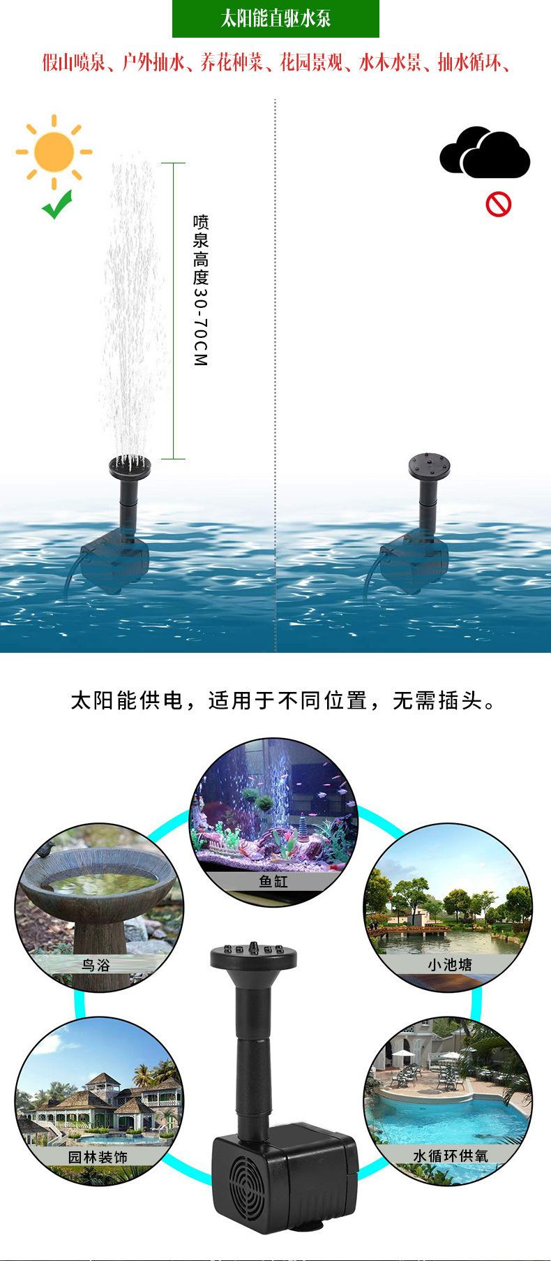 La fuente solar es un dispositivo de fuente paisajística que utiliza energía solar para accionar una bomba de agua para bombear agua. Este producto utiliza paneles solares de alta eficiencia y una nueva bomba de agua sin escobillas, que tiene las ventajas de arranque rápido, alta eficiencia y fuerte estabilidad. Además, el producto flota sobre el agua, no requiere una fuente de alimentación externa, es fácil de instalar y sencillo de operar. Se utiliza ampliamente en lugares como decoración de jardines, bebederos para pájaros, circulación y oxigenación del agua de pequeños estanques, fuentes de rocalla, etc. Es sencillo de instalar y fácil de usar. Siempre que haya luz solar directa, la bomba de agua puede empezar a funcionar.