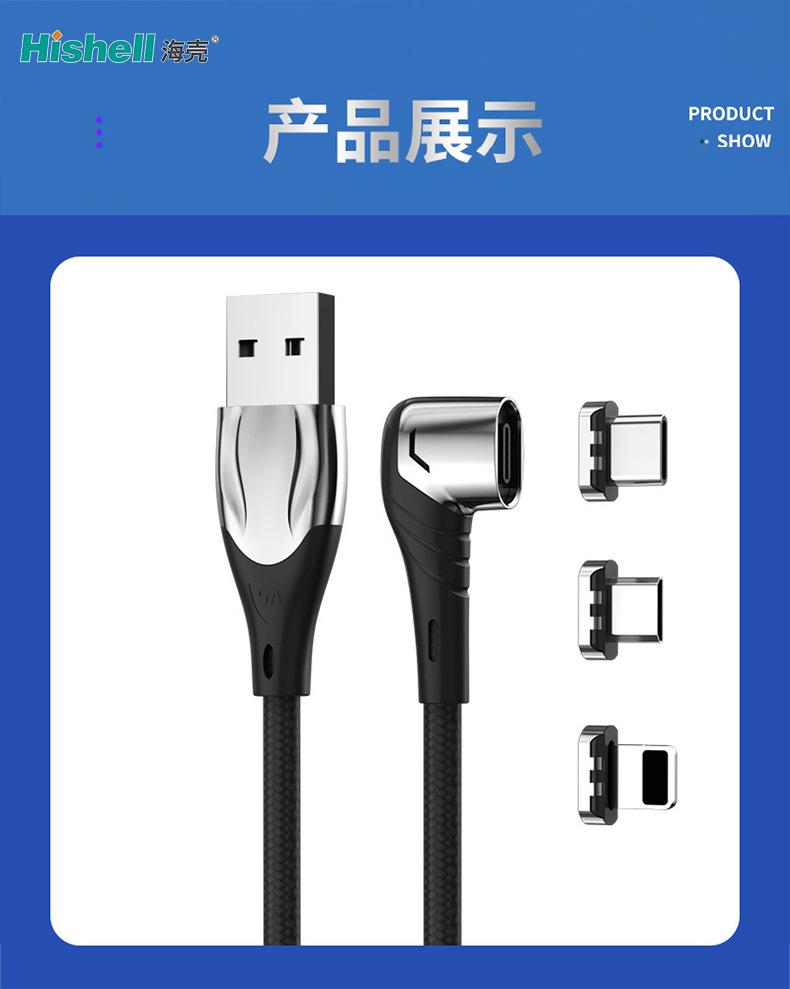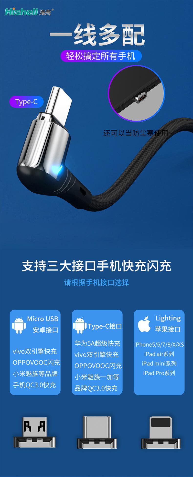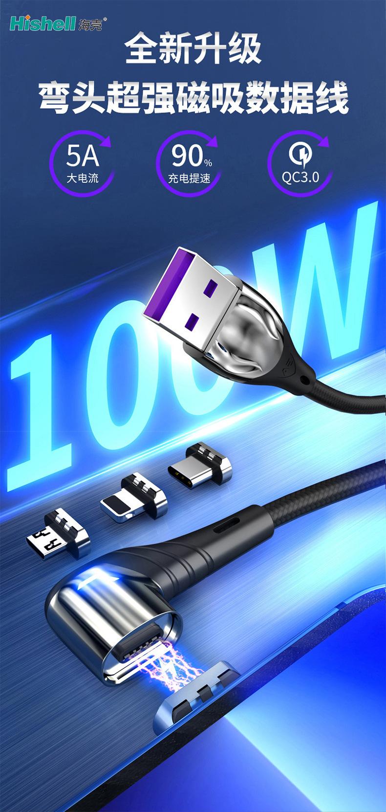 Cable de datos USB portátil de 100 W con codo, cable de carga magnético plano, carga súper rápida de 5 A para Android y Apple.