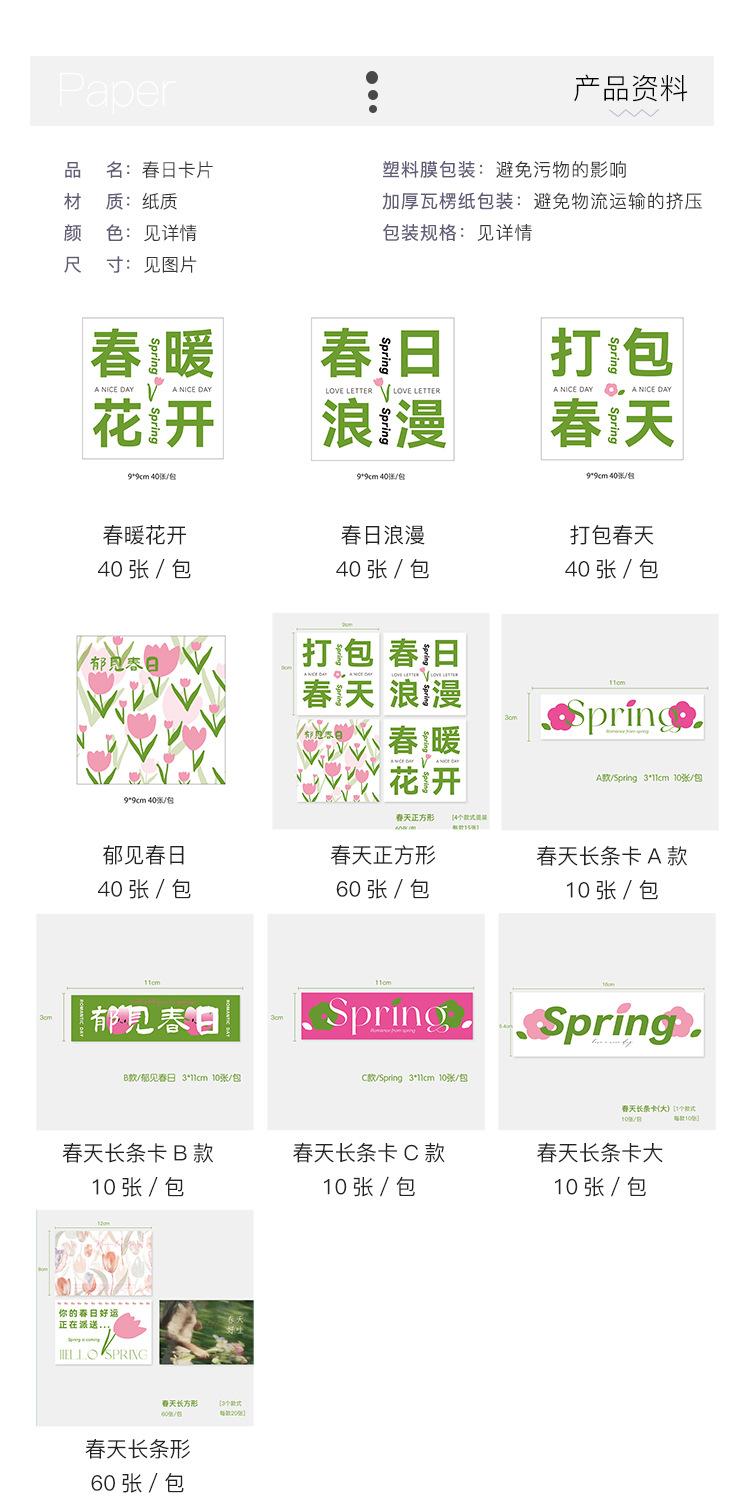 10 long cards in spring, Magenta long card 10, Spring square card 4 each 15, Spring rectangular card 3 each 20...