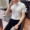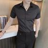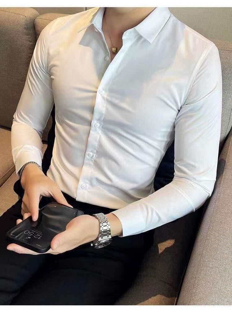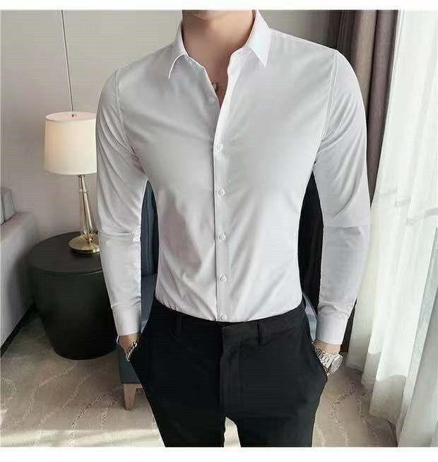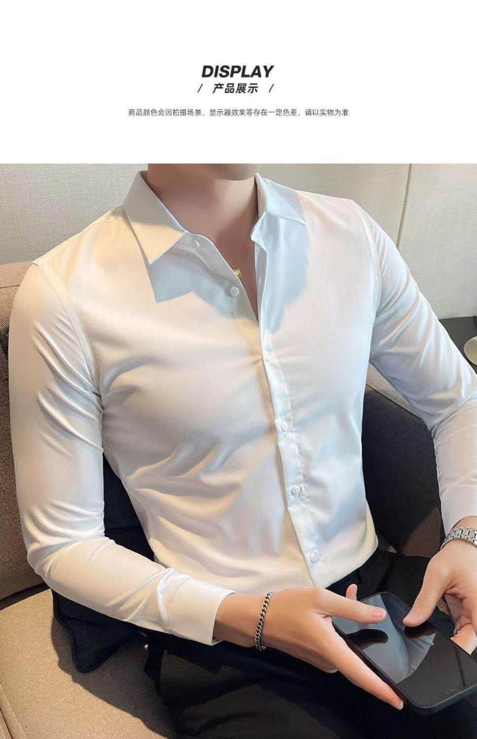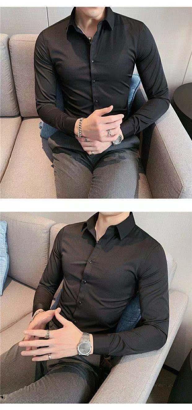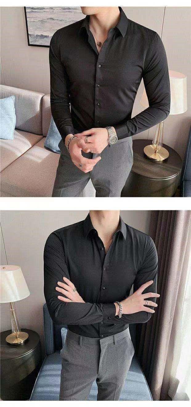 Camisa de manga larga elástica, ajustada, fina, negra, informal, de negocios, profesional, formal, ropa de trabajo, camisa de trabajo para hombres