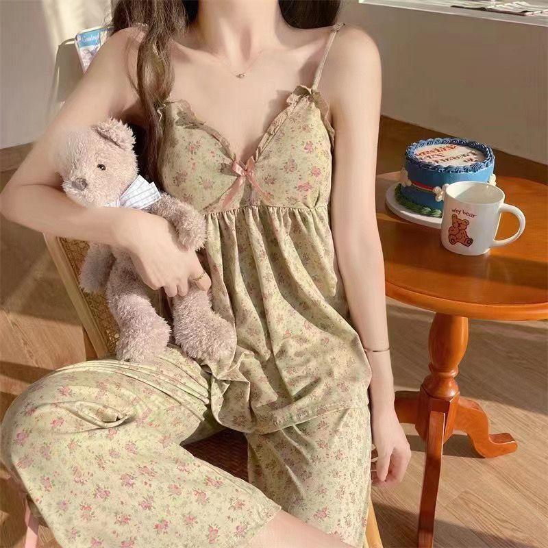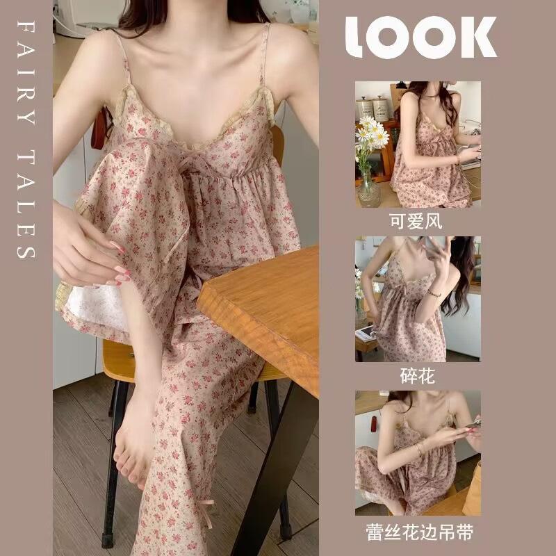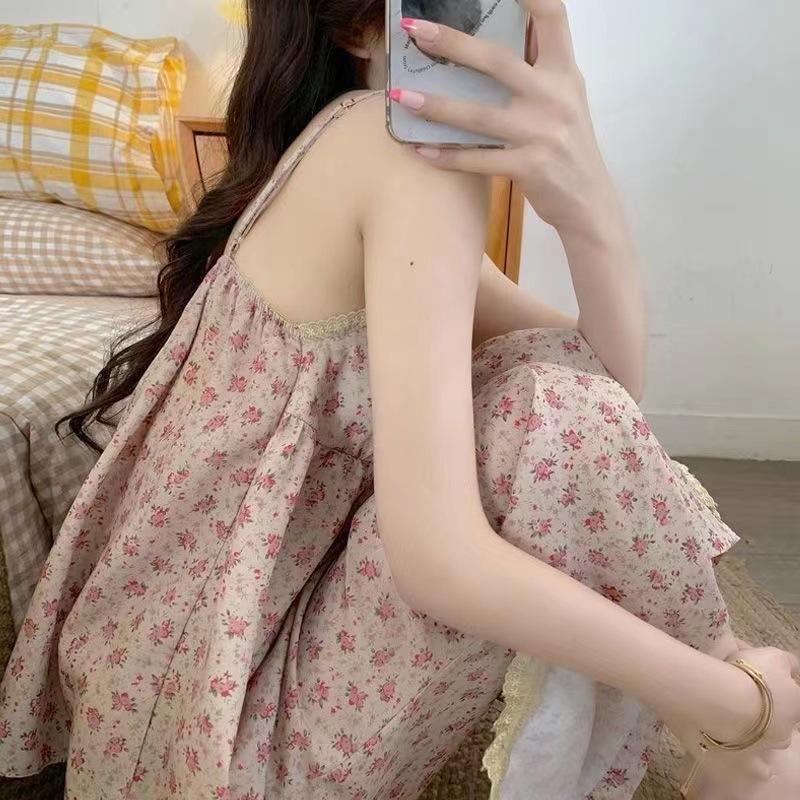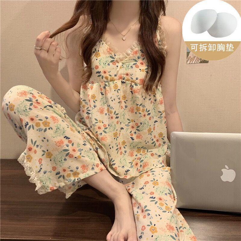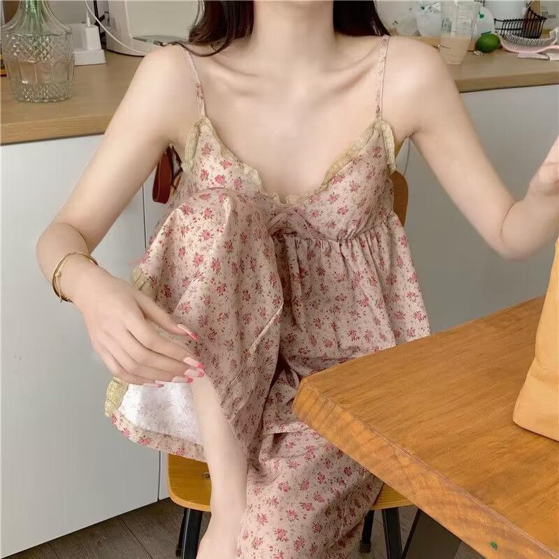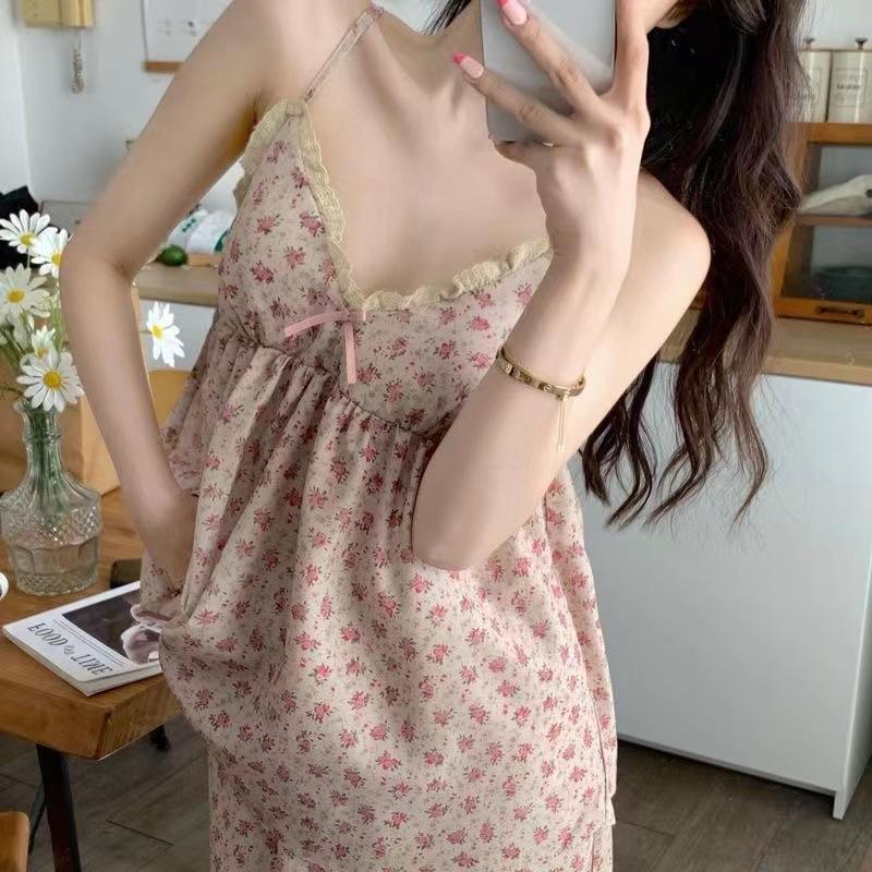 Pijama estilo pastoral sexy con escote en V y tirantes para mujer, con almohadilla para el pecho, de encaje fresco de verano, ropa para el hogar