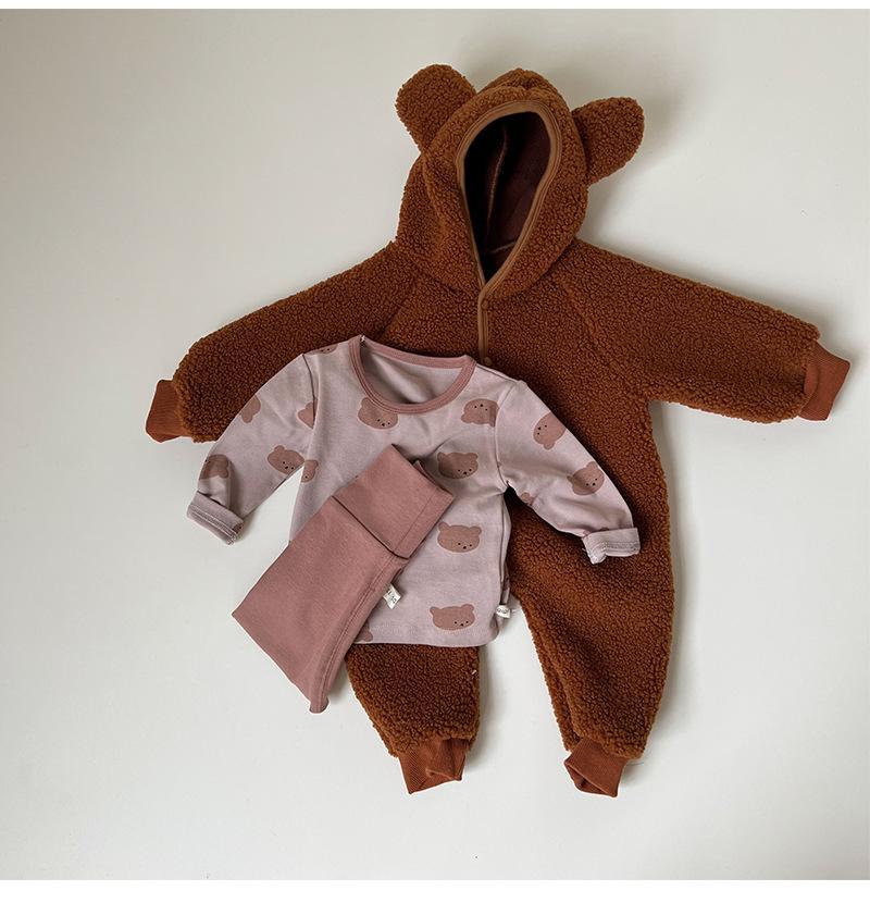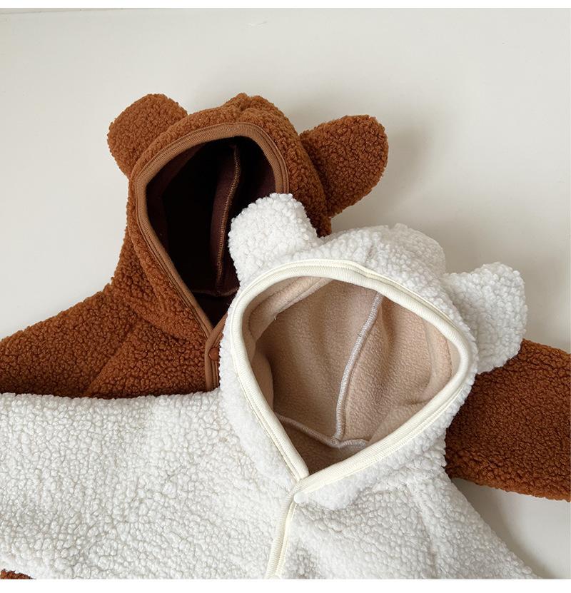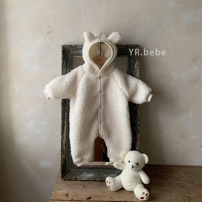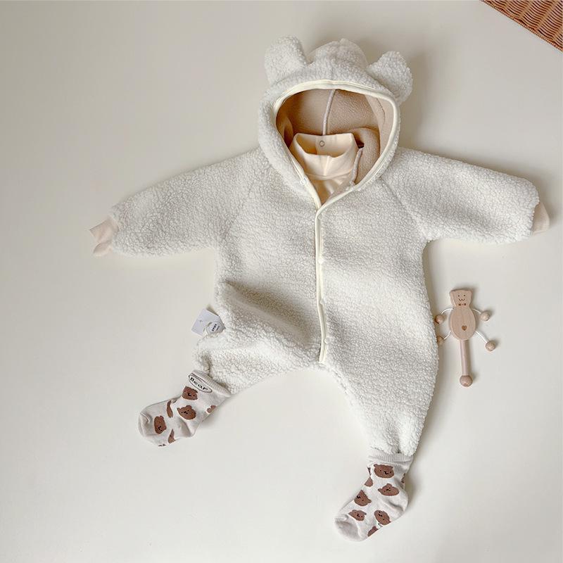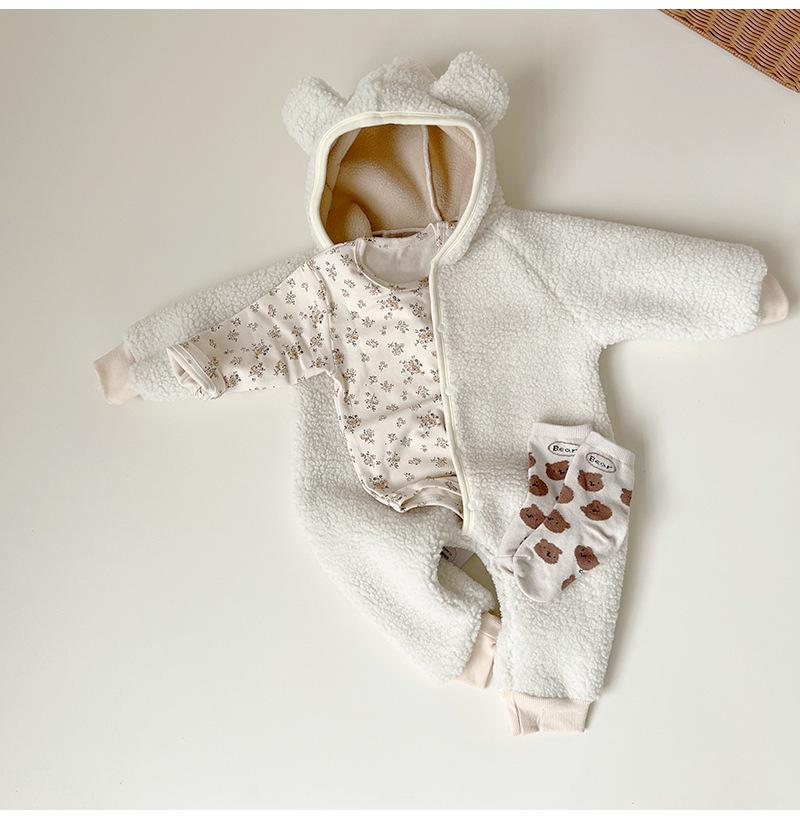 Nuevo mono de lana de cordero para bebé de estilo coreano en stock, grueso y cálido, ropa para niños y niñas de otoño e invierno.