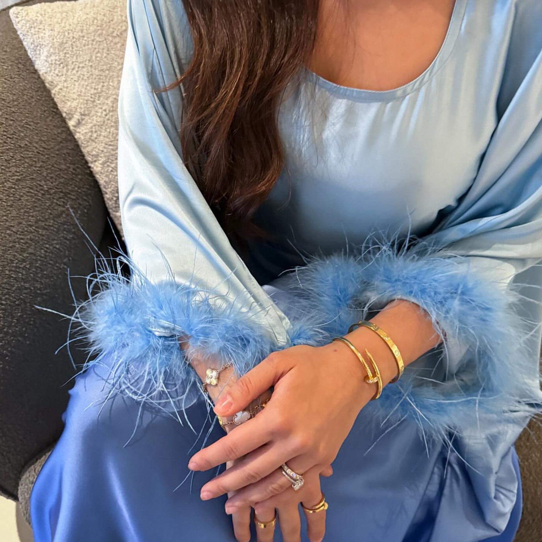 Este estilo es un vestido con puños de piel y un cinturón conectado al interior del vestido.