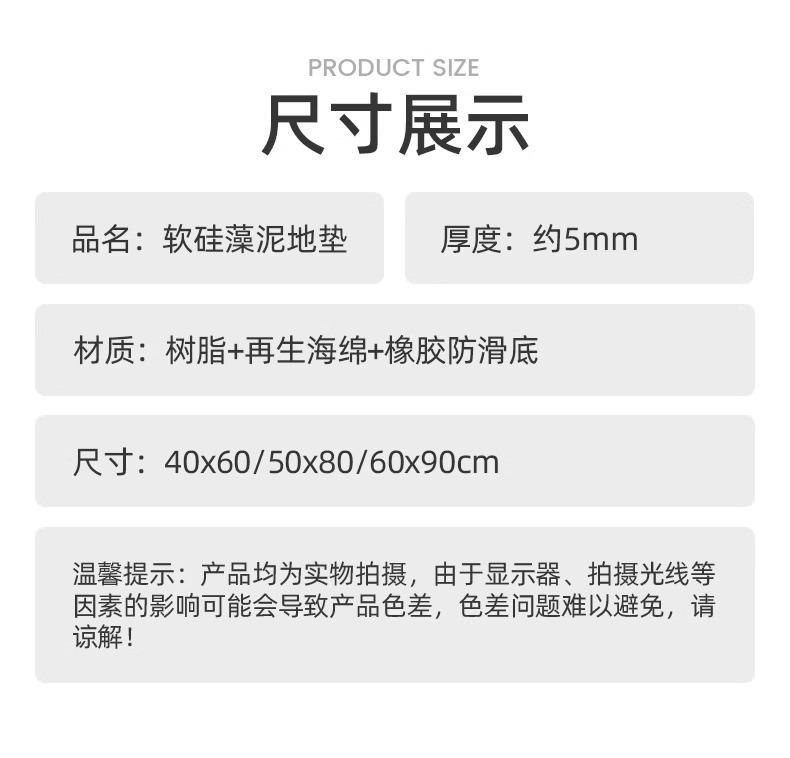 40*60cm (diatom mud dirt-resistant easy to clean), 50*80cm (diatom mud slip does not shift), 60*90cm (diatom m...