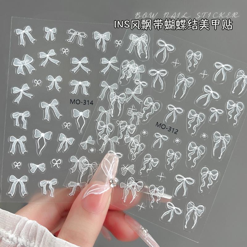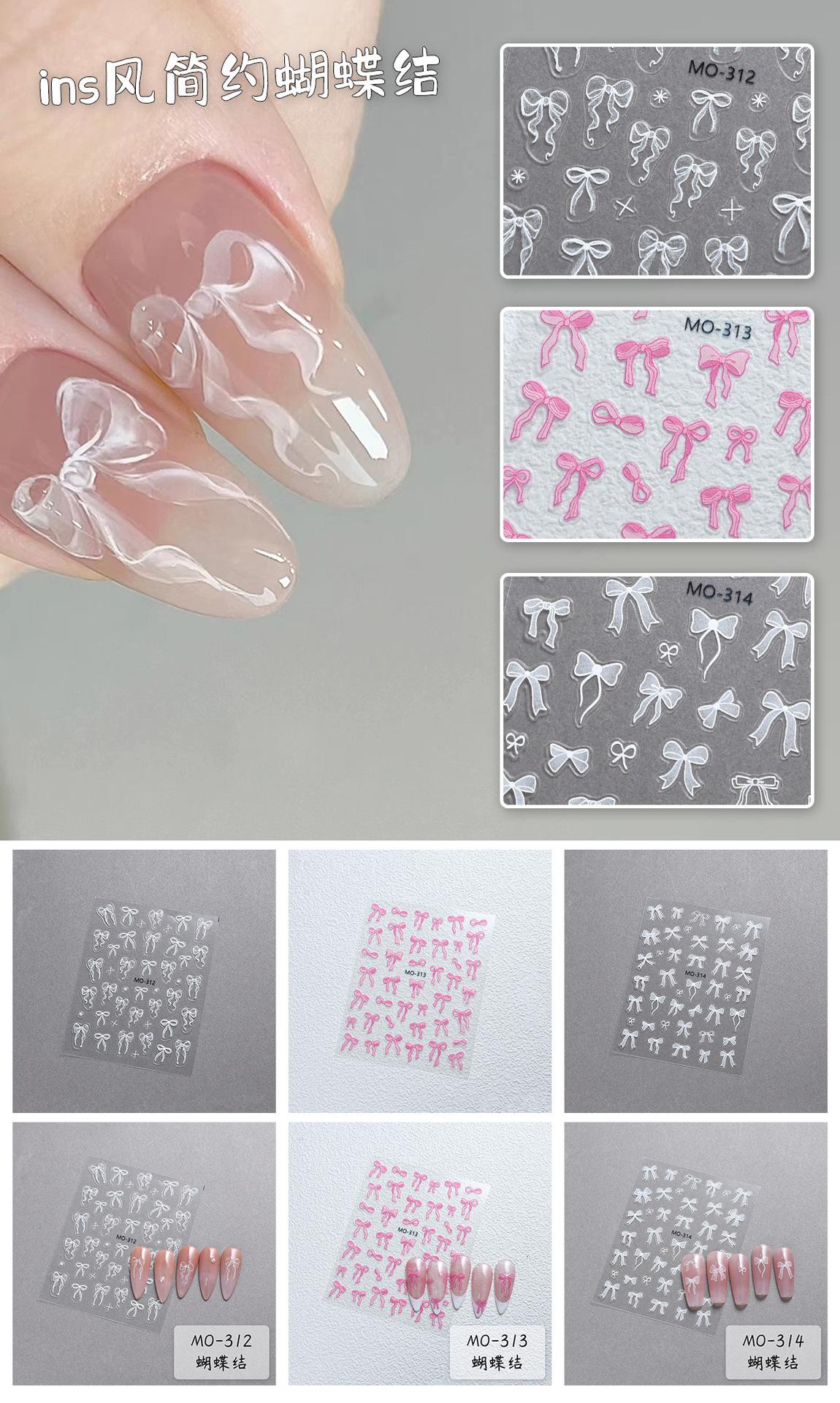 Pegatinas de lazo para decoración de uñas, diseño de corazón, lazo de cinta rosa y blanco, con relieve estéreo para niña