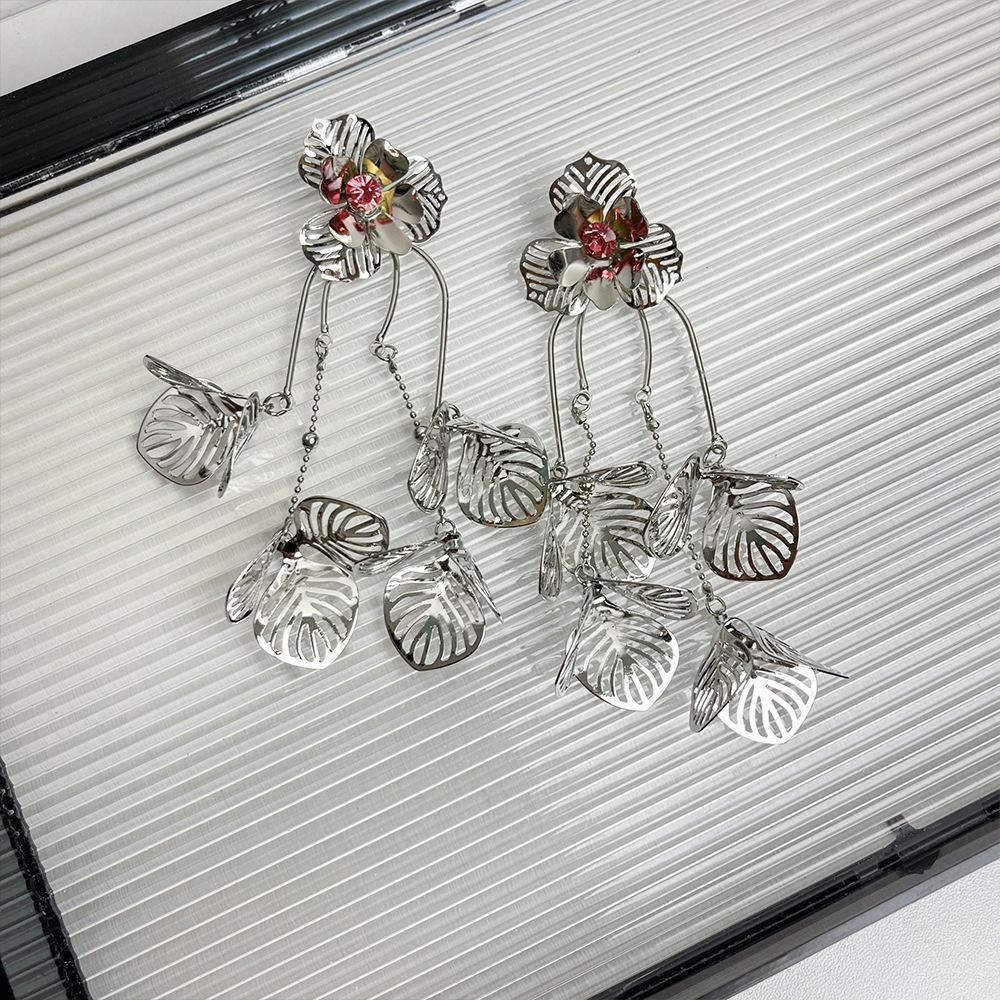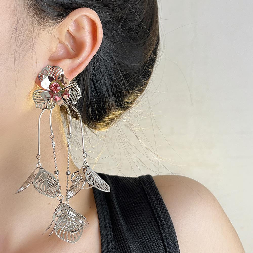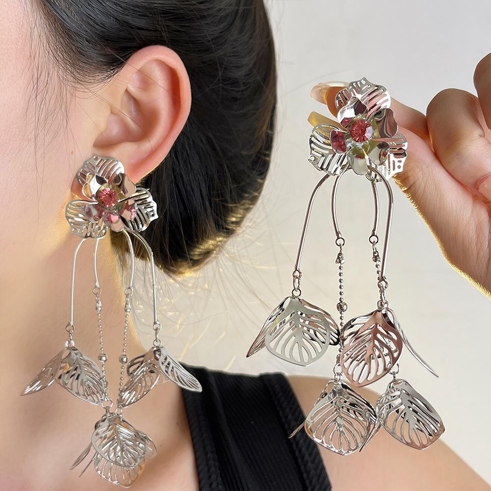 Pendientes de metal con diseño de flor de diamante y hojas huecas, de estilo europeo y americano, con borlas, ligeros y lujosos.