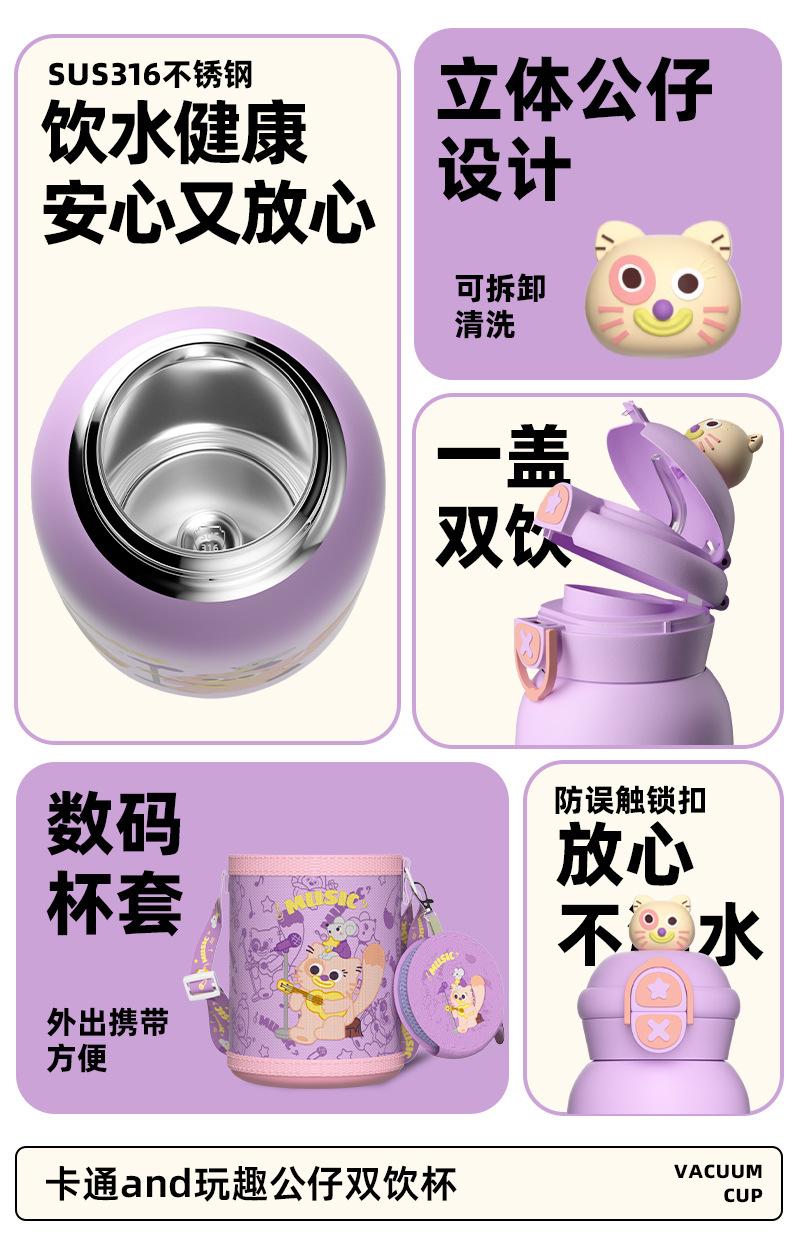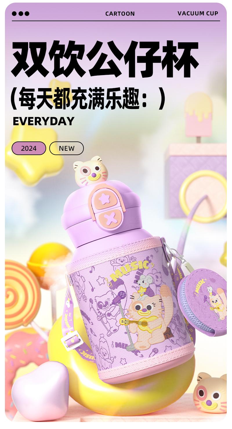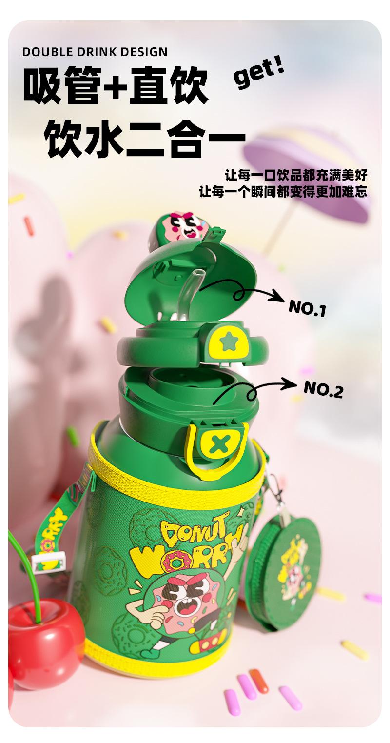 Termo para niños con pajita, botella de agua con correa doble, diseño de dibujos animados de alto valor para estudiantes