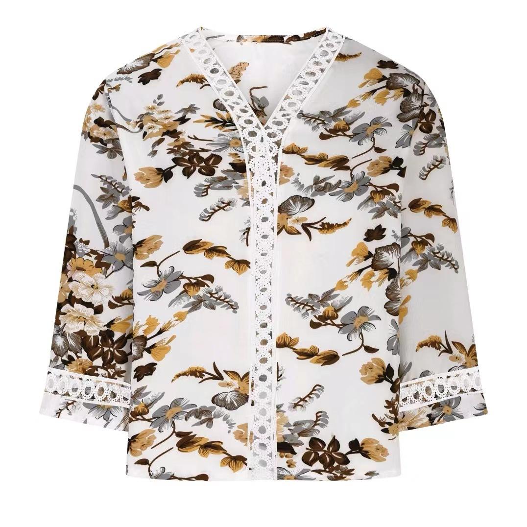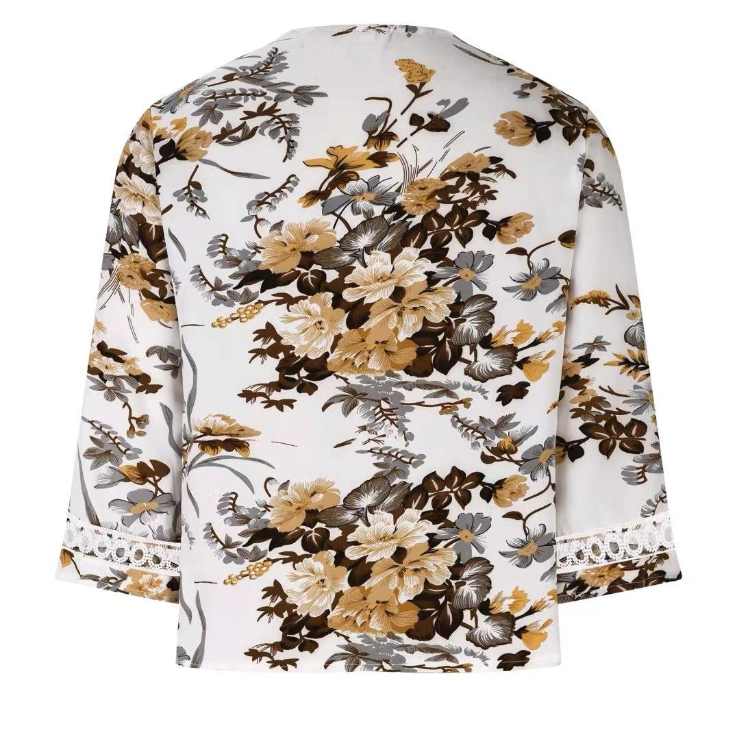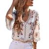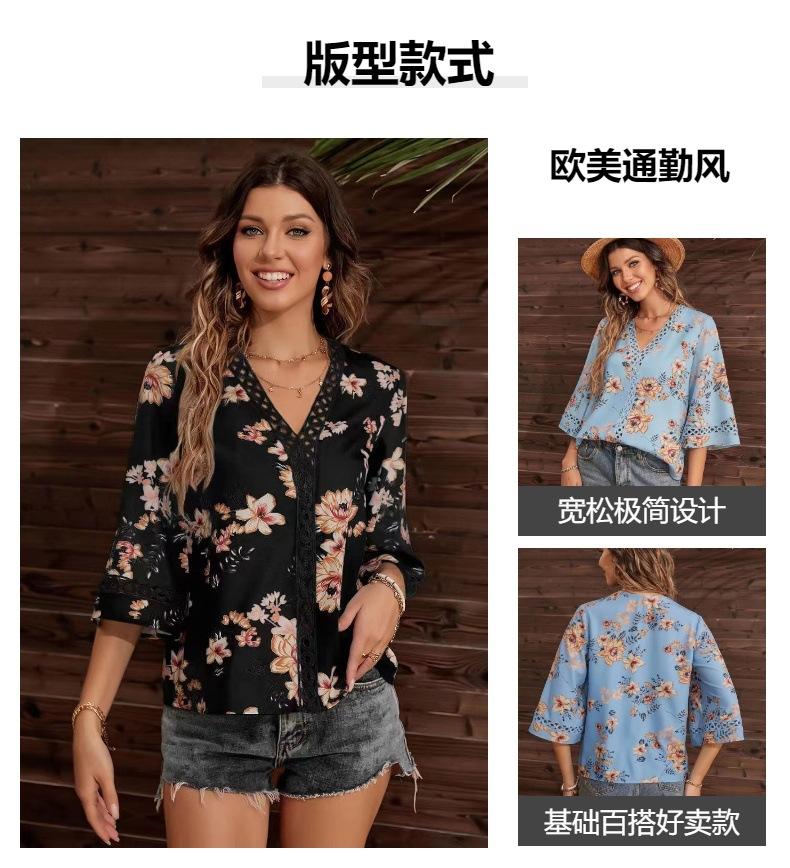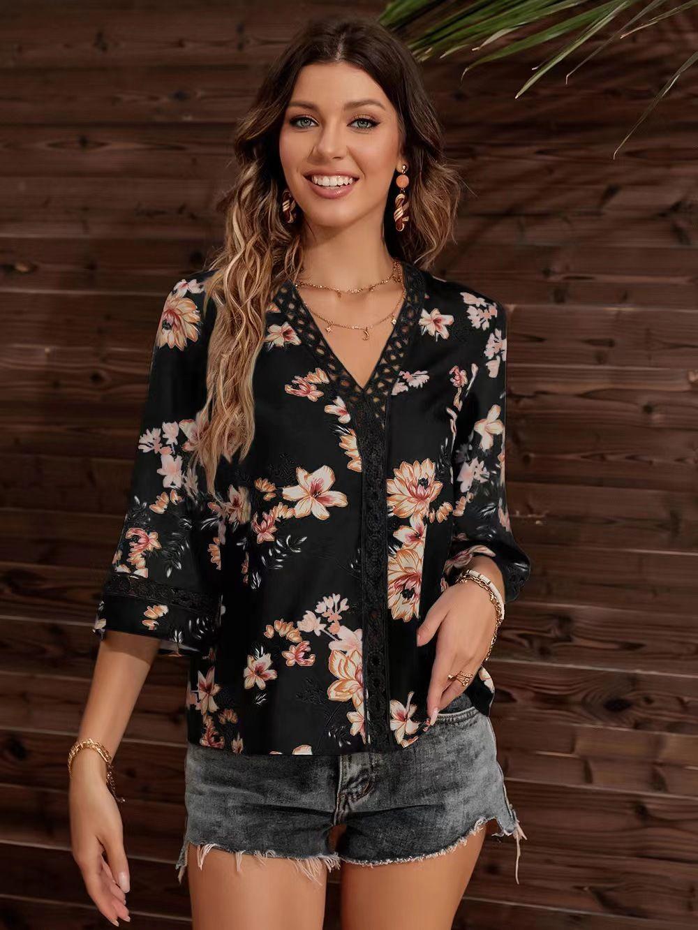 2025 Exportación Transfronteriza Europea y Americana Nuevo Estilo Urbano Cuello en V Trompeta Manga Tres Cuartos Top Holgado Estampado Camisa de Encaje para Mujer