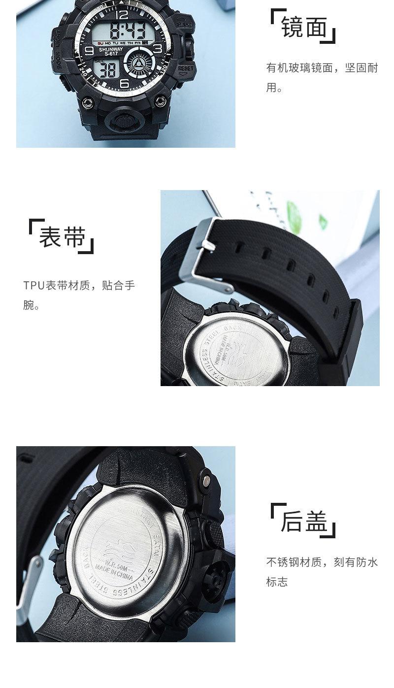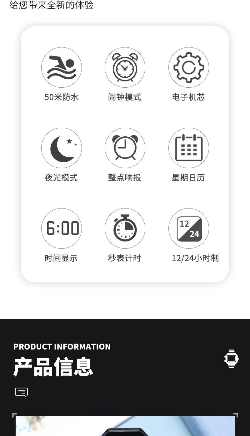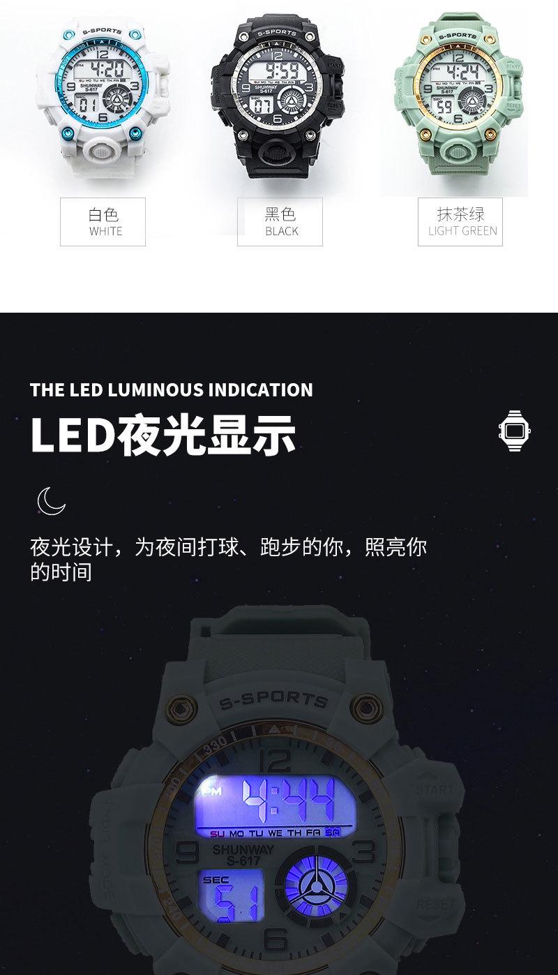 Luminous, stopwatch timing, time, week, date display, 12/24 hour system, alarm clock mode, hour alarm