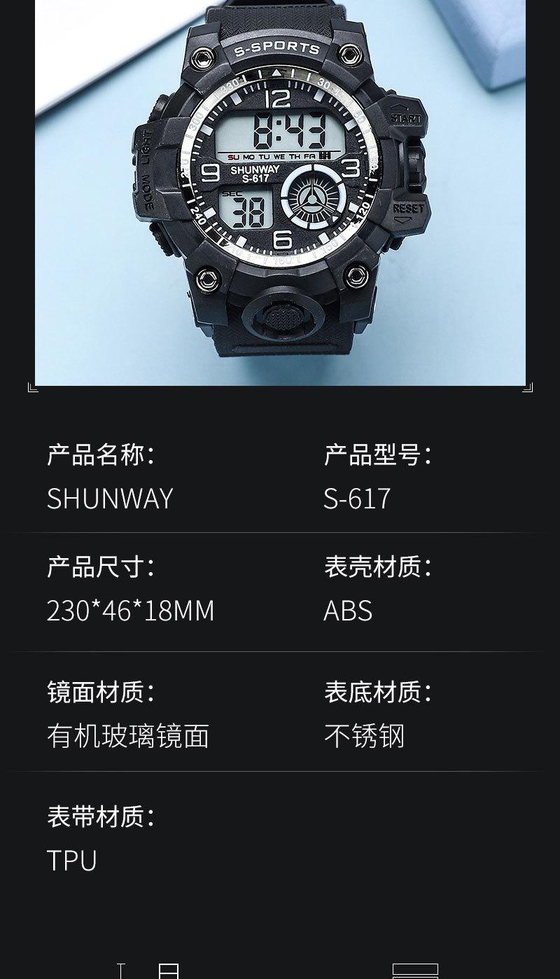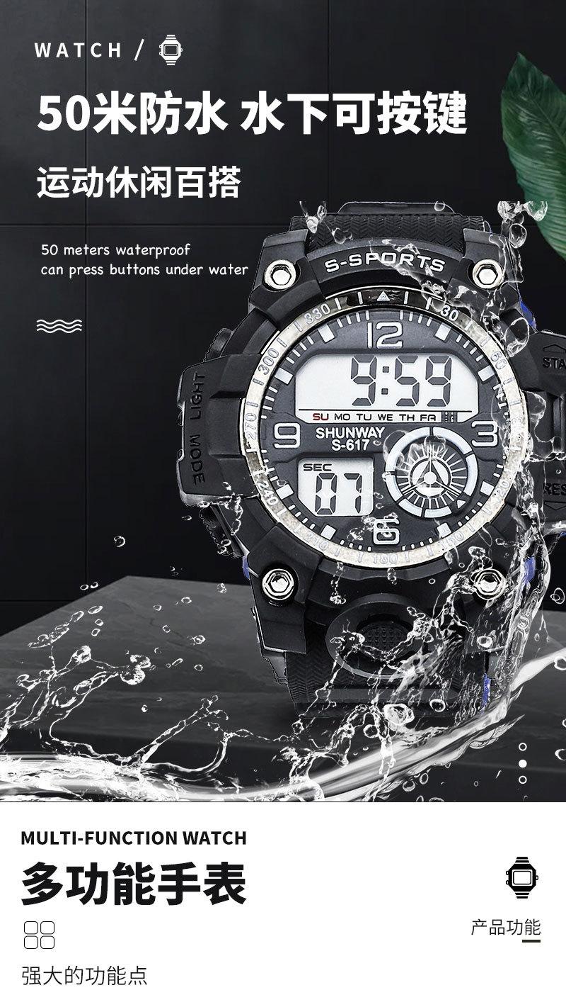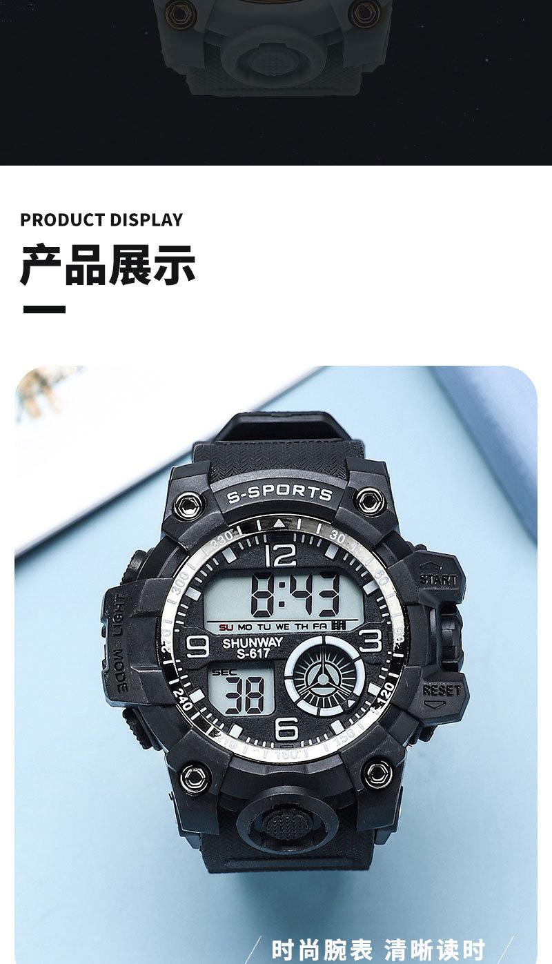 Luminous, stopwatch timing, time, week, date display, 12/24 hour system, alarm clock mode, hour alarm