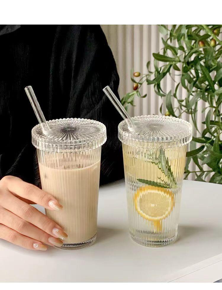 Vaso de Vidrio Rayado Ins con Tapa y Popote Vaso de Agua de Vidrio para el Hogar de Alto Valor Vaso para Bebidas Frías Vaso para Leche Engrosado