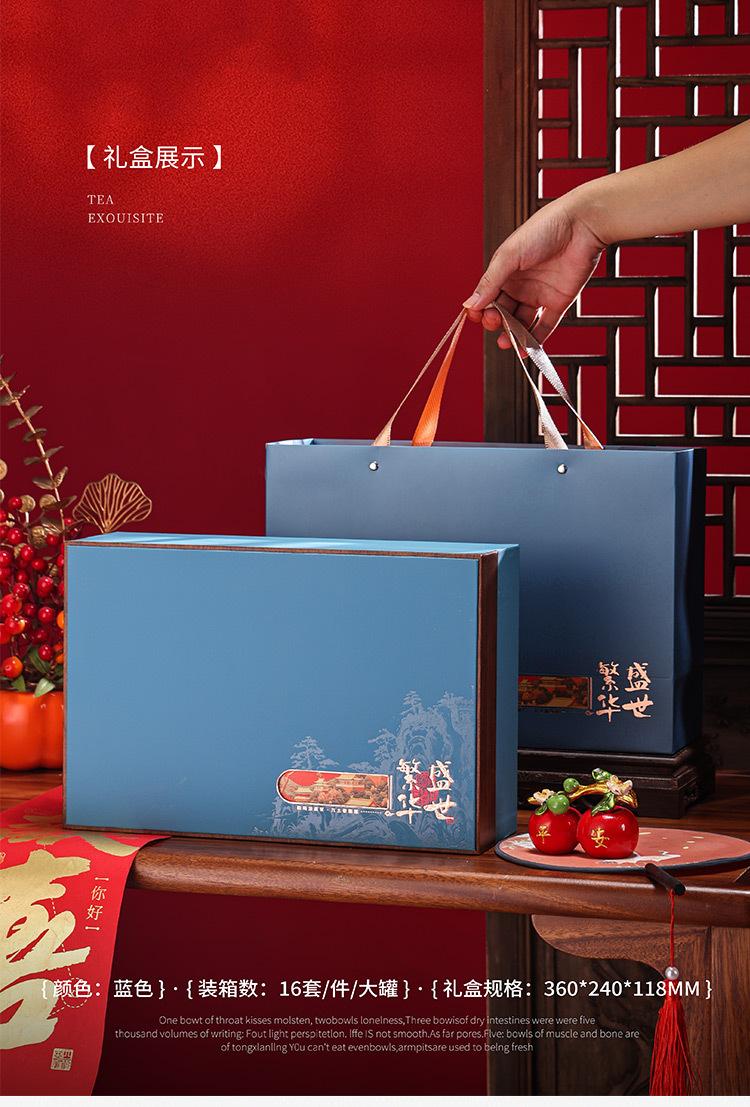 Prosperous times: [blue empty box]; 3 large compartments: for a full case, please order a quantity of 16 sets; red/blue/orange