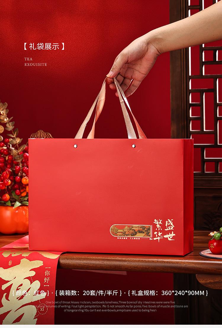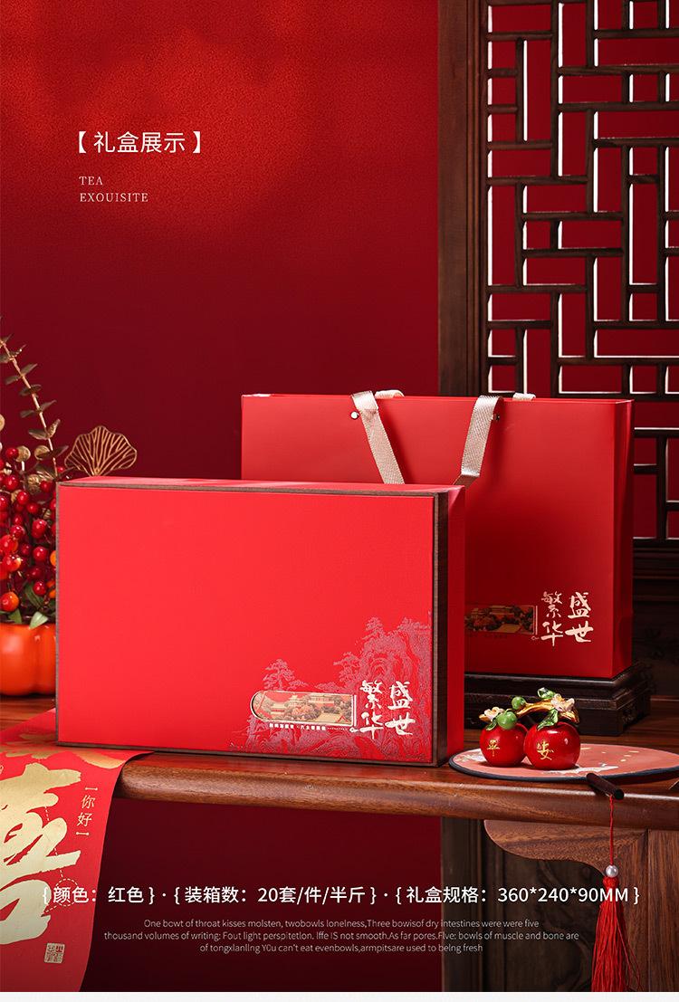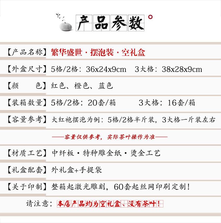 Prosperous times: [blue empty box]; 5-compartment pack: for a full case, please order a quantity of 20 sets; red/blue/orange