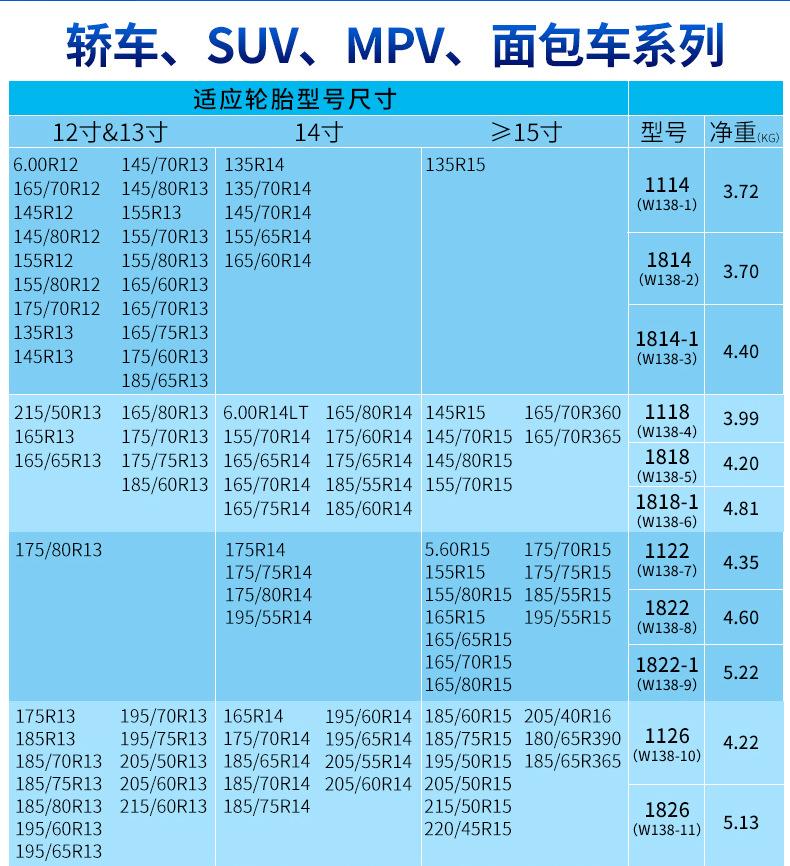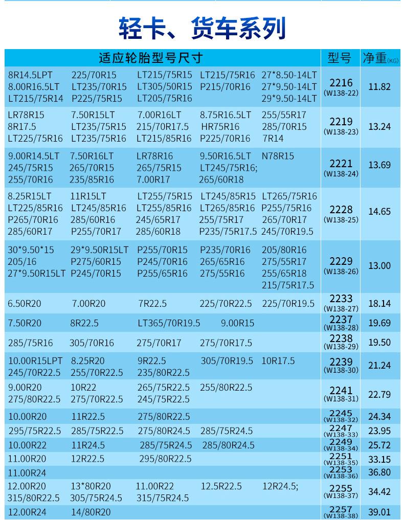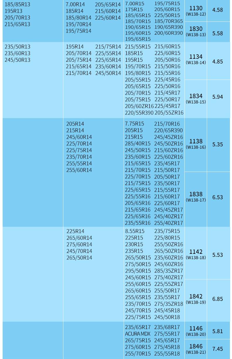 En la parte inferior del enlace hay una tabla de diferentes modelos de neumáticos para cada configuración.