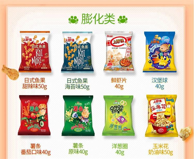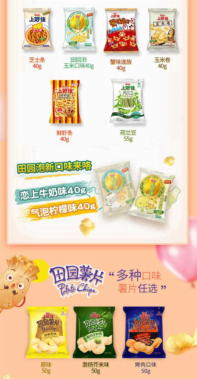 Shanghaojia 40g-50g con varias especificaciones y sabores, tamaño de caja 20 bolsas. Ventas por caja completa, sin mezclar, bienvenidos clientes mayoristas de supermercados físicos para cooperar.