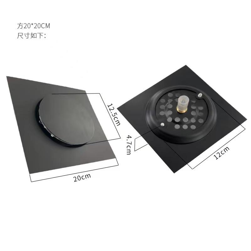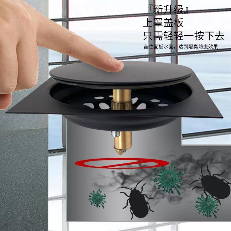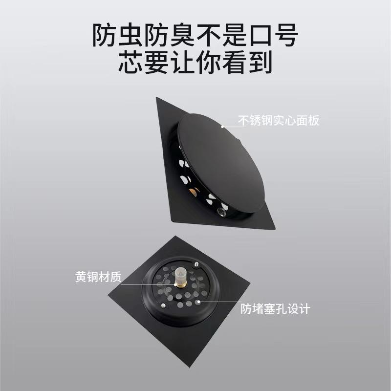 Drenaje de piso de acero inoxidable de ingeniería, tipo prensa, gran desplazamiento, oculto, desodorante para inodoro, prevención de insectos, color negro