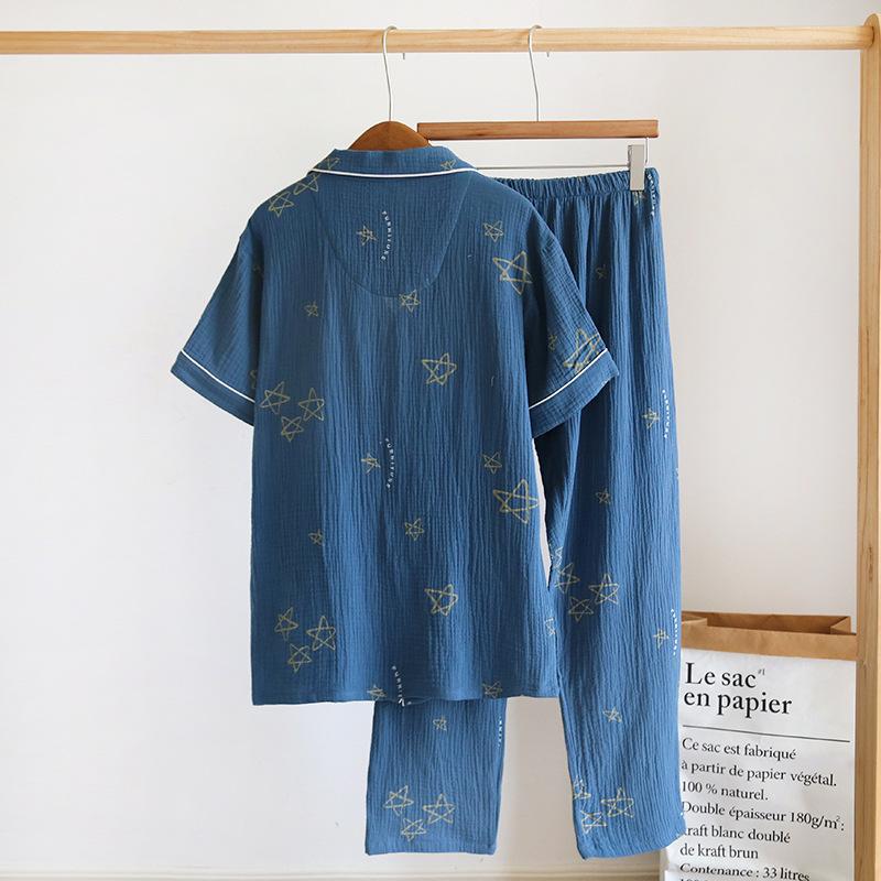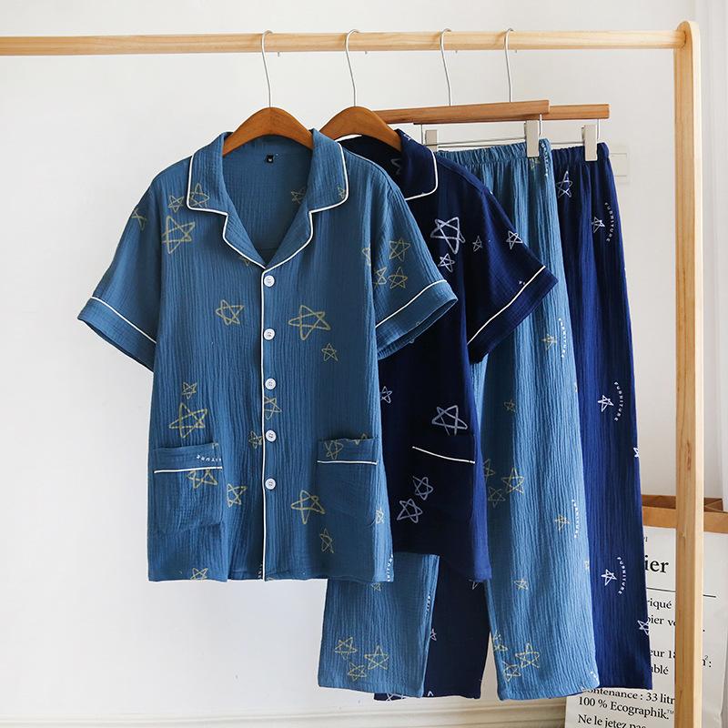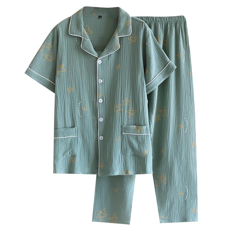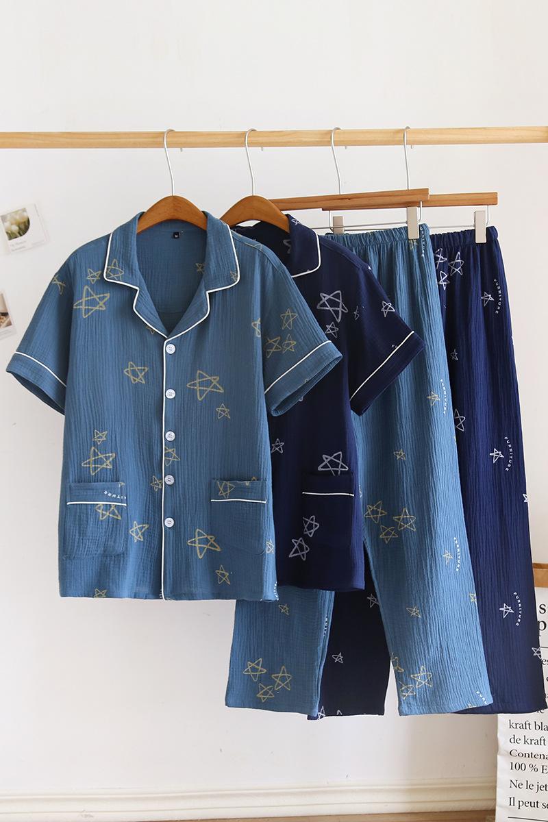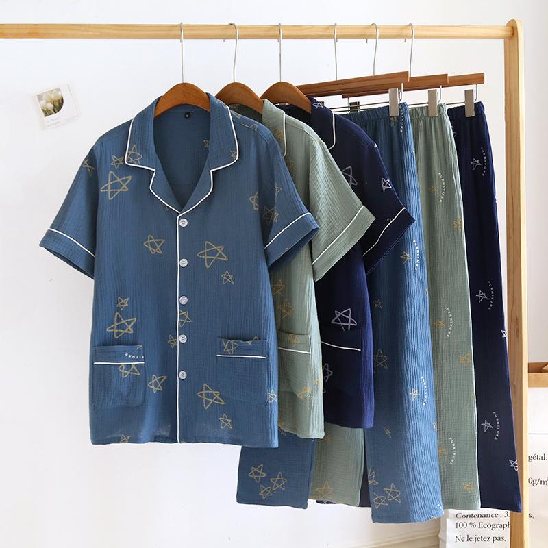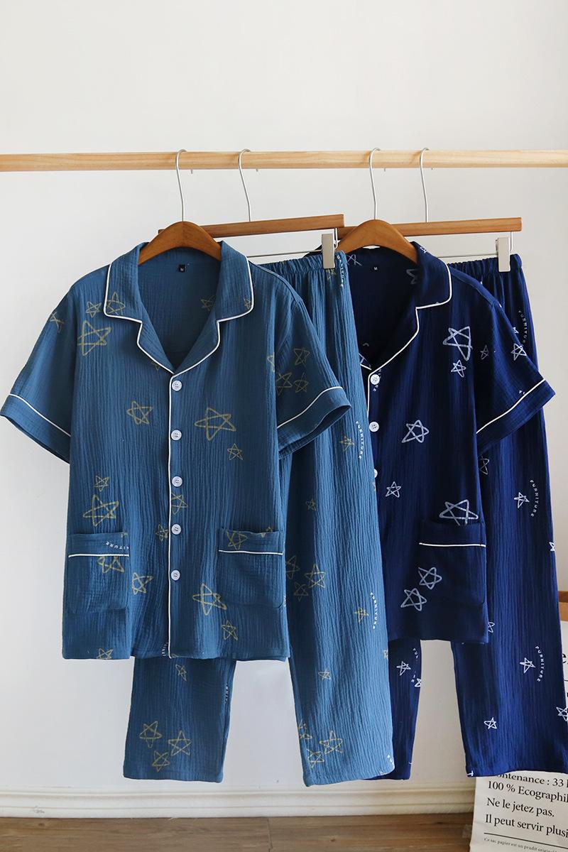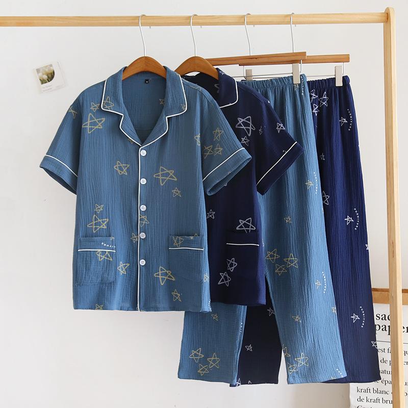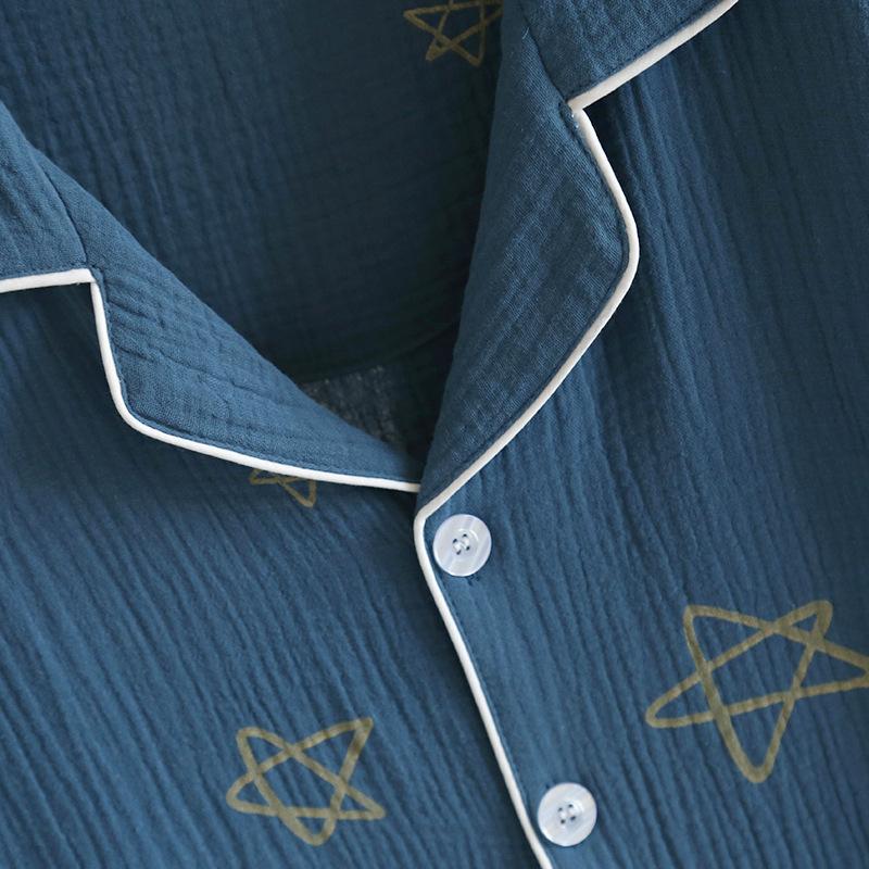 Traje de Crepé para Hombre Nuevo para Casa Primavera y Otoño Estrella de Cinco Puntas Manga Corta Pantalones Algodón Bicolor Pijama para Casa Transpirable Absorción de Sudor