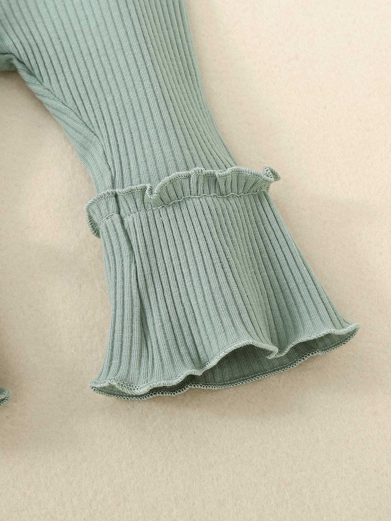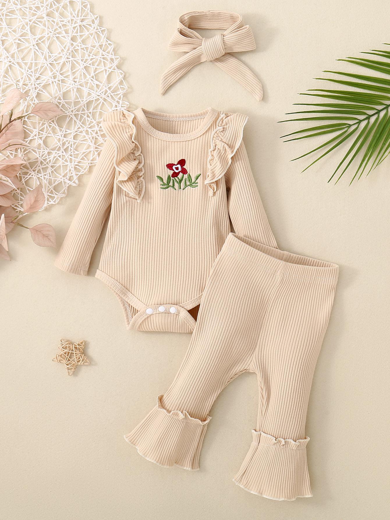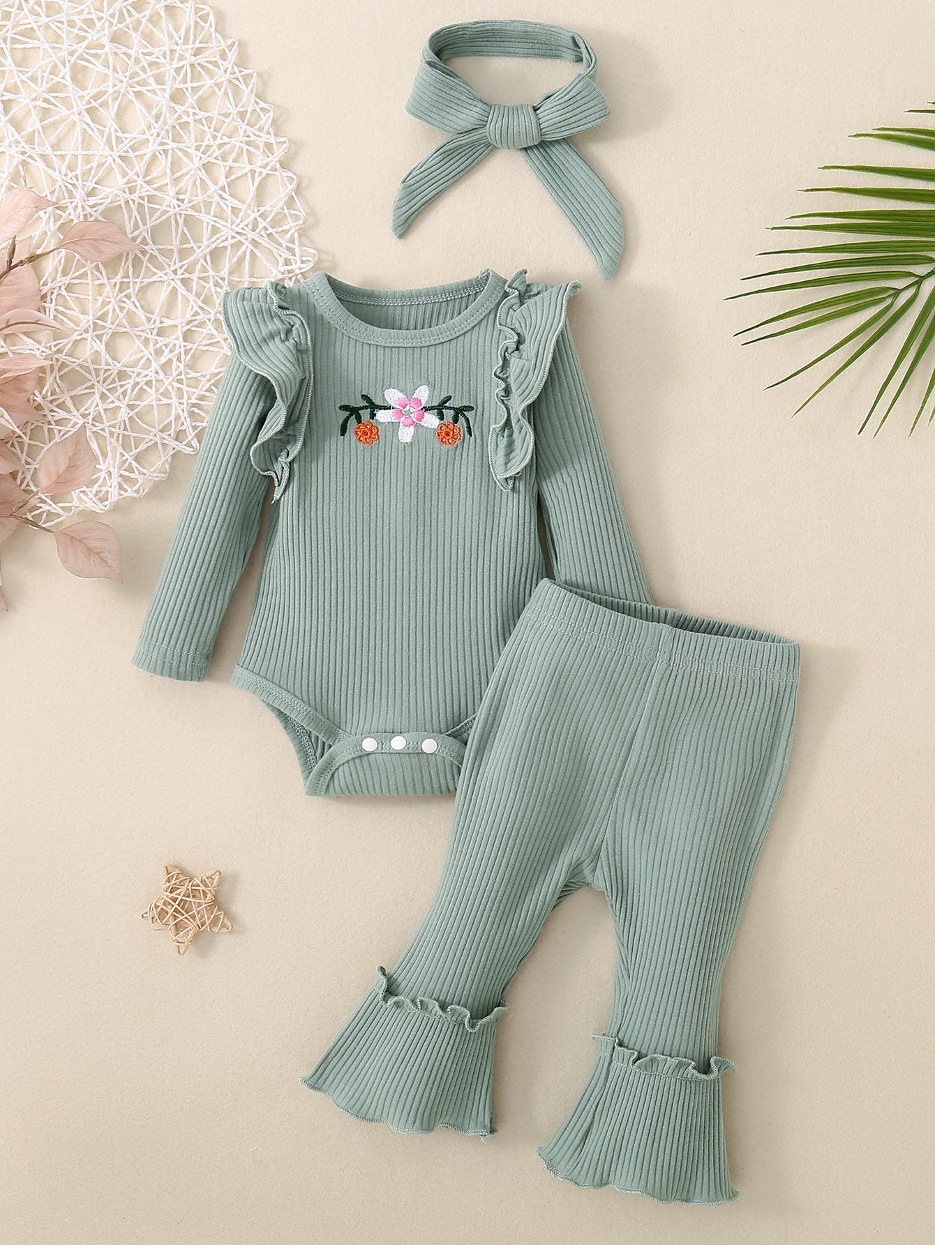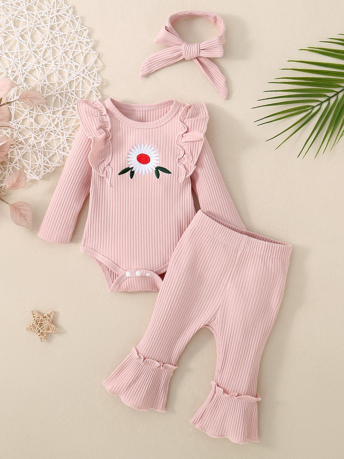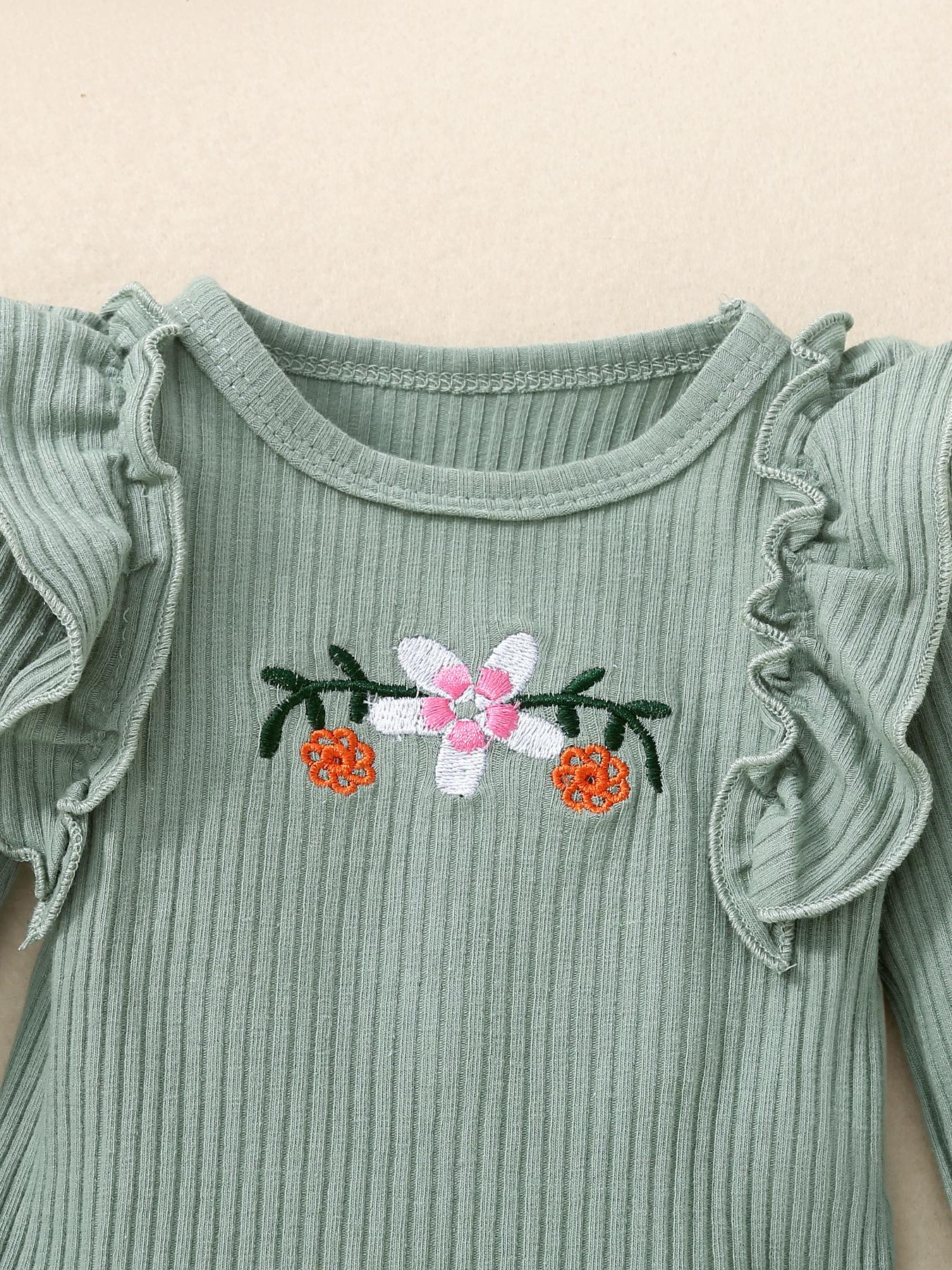 Traje de pantalón acampanado de color liso con bordado de flores para niña pequeña con borde cruzado