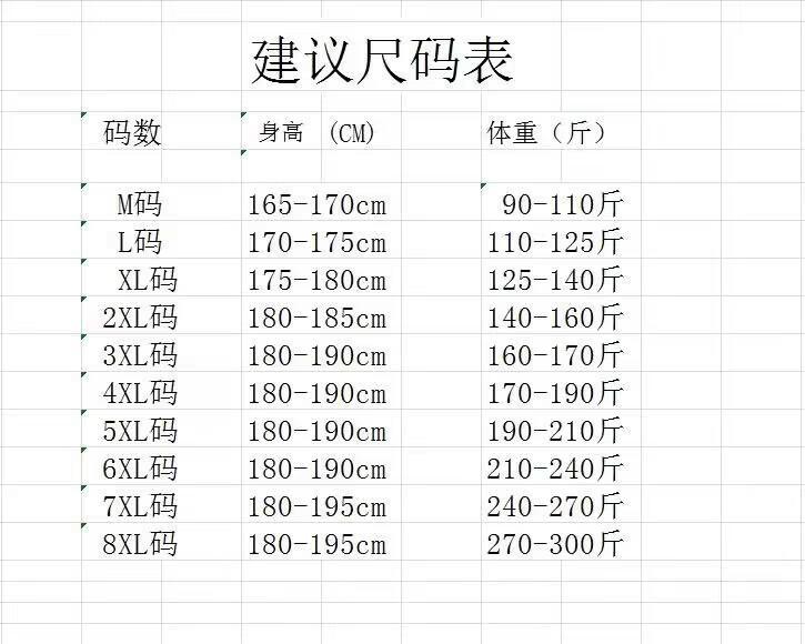 M, L, XL, XXL, 3XL, 4XL, 5XL, 6XL, 7XL, 8XL