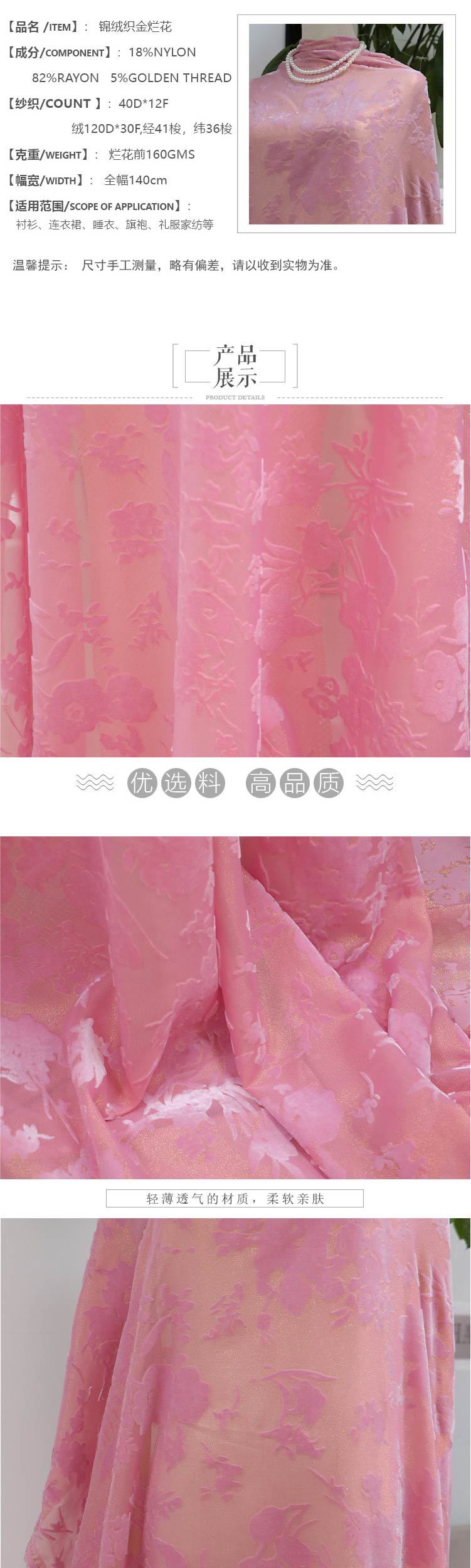 Venta al por mayor de fábrica 140 Tejido de terciopelo de nailon tejido dorado terciopelo quemado Tejido para vestido Cheongsam Tejido para falda