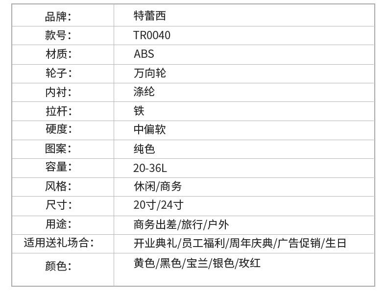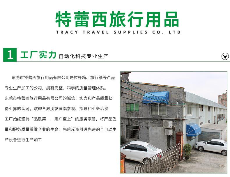 Dongguan Tracy Travel Products Co., Ltd. es una empresa especializada en la producción y procesamiento de maletas con ruedas, maletas y otros productos, y cuenta con un sistema de gestión de calidad completo y científico.