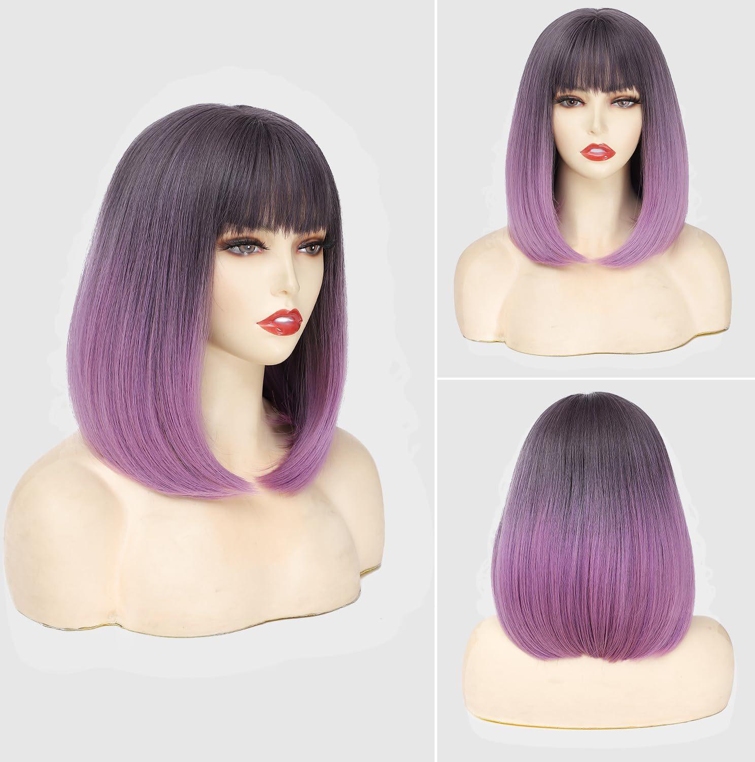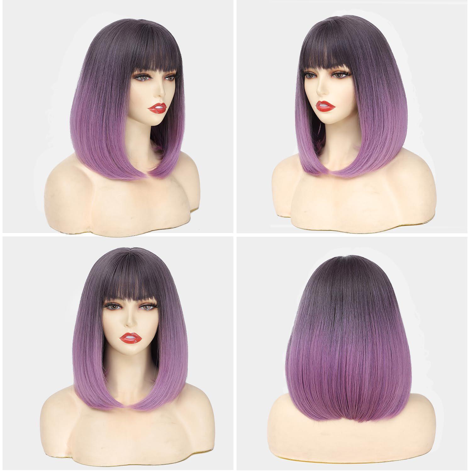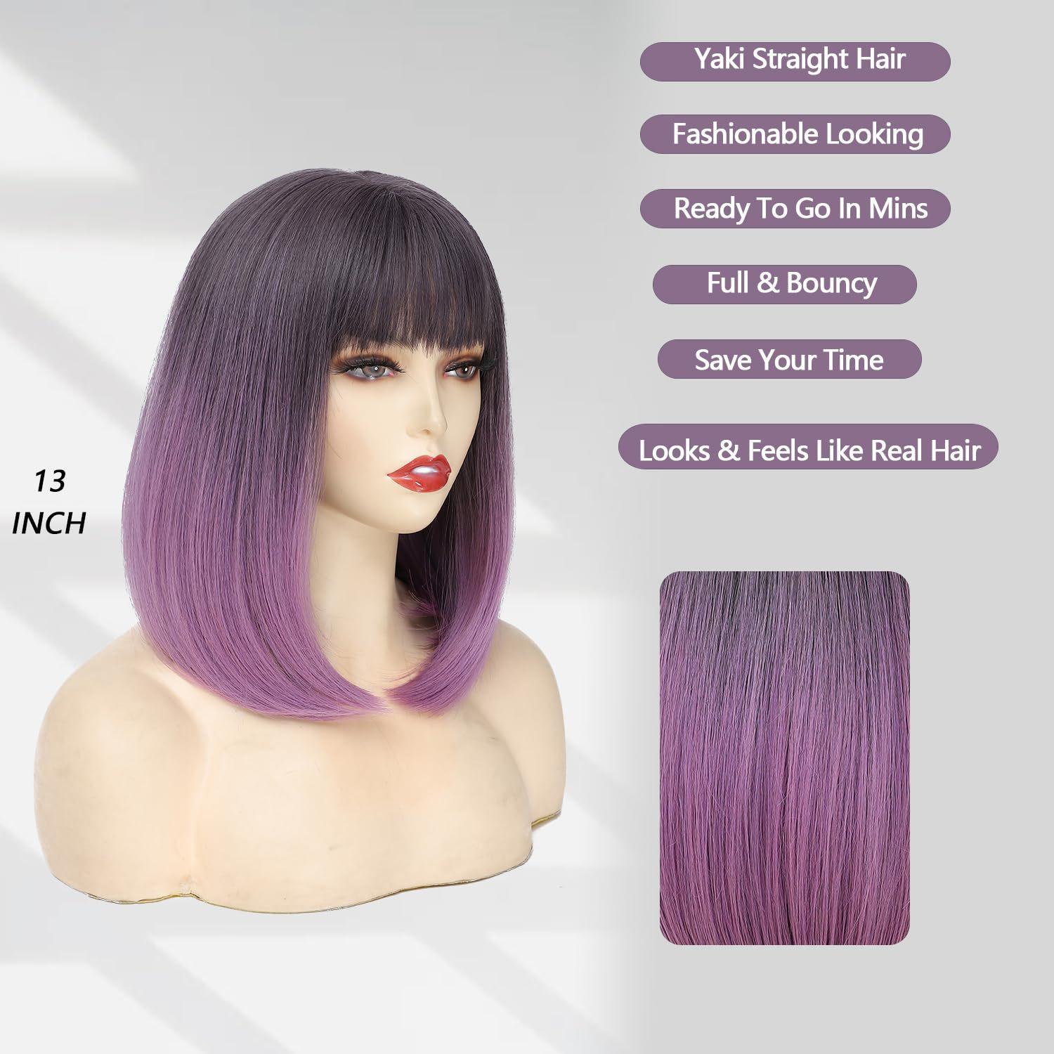 Peluca de mujer europea y americana transfronteriza, cabello corto y liso, degradado morado, flequillo recto, cabeza bobo, peluca de fibra química de seda de alta temperatura, tocado