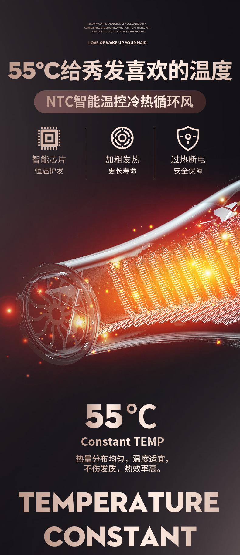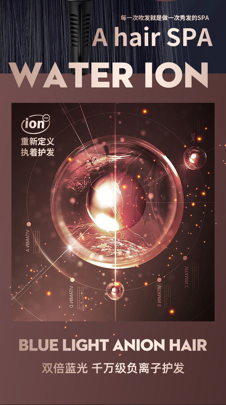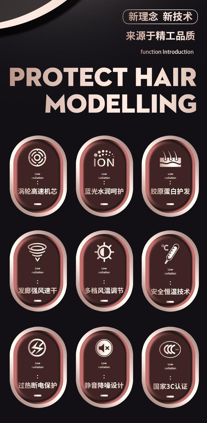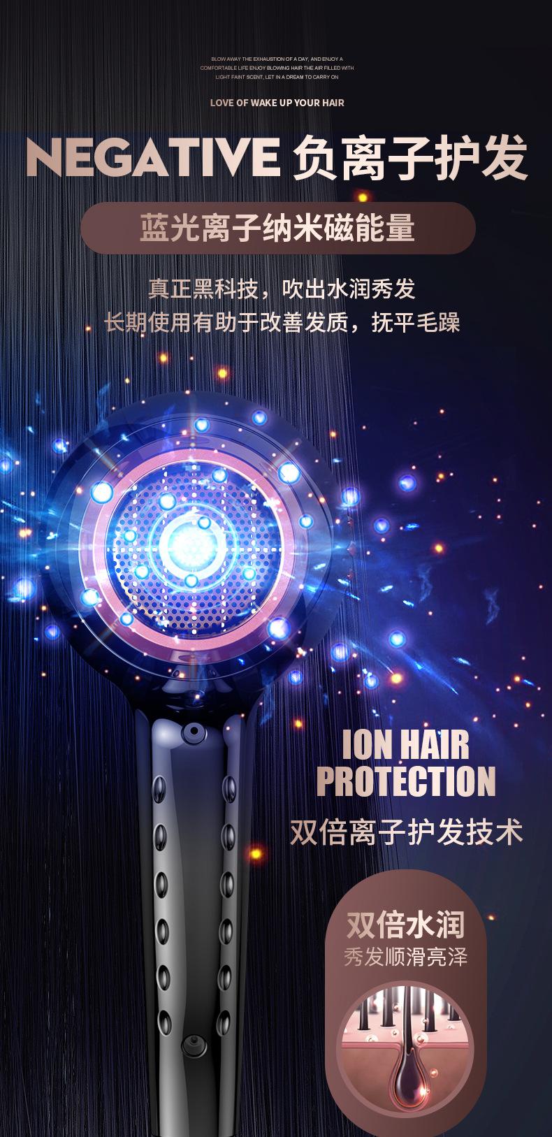Blue light, Negative ions, Constant temperature hair care, Hot and cold alternating wind