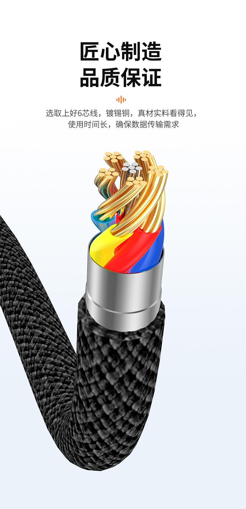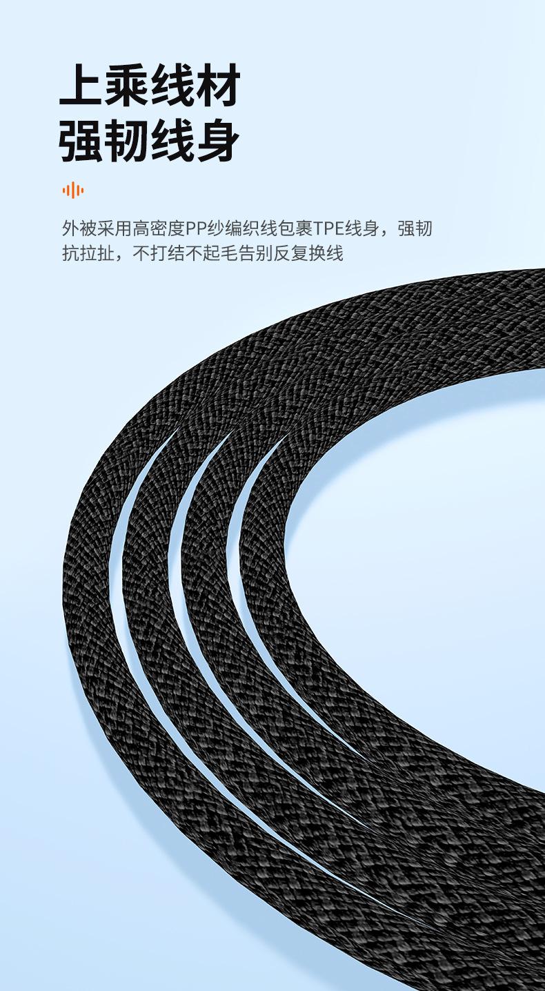 5. Es más seguro usar cable retardante de llama. La funda exterior está hecha de hilo de PP de alta densidad trenzado envuelto con el cuerpo del cable TPE, que es fuerte y resistente a la tracción, no se enreda ni suelta pelusa, y no es necesario cambiar los cables repetidamente.