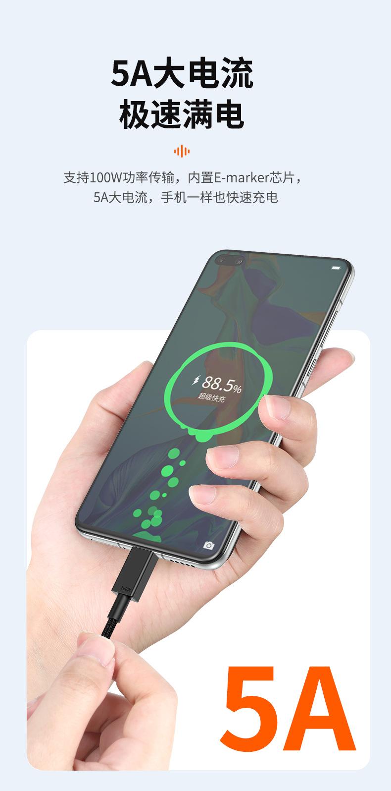3. El chip E-MARK integrado de 100 W puede transportar alta corriente de 5 A y puede cargar rápidamente dispositivos inteligentes que admiten carga rápida PD