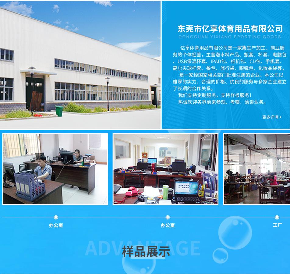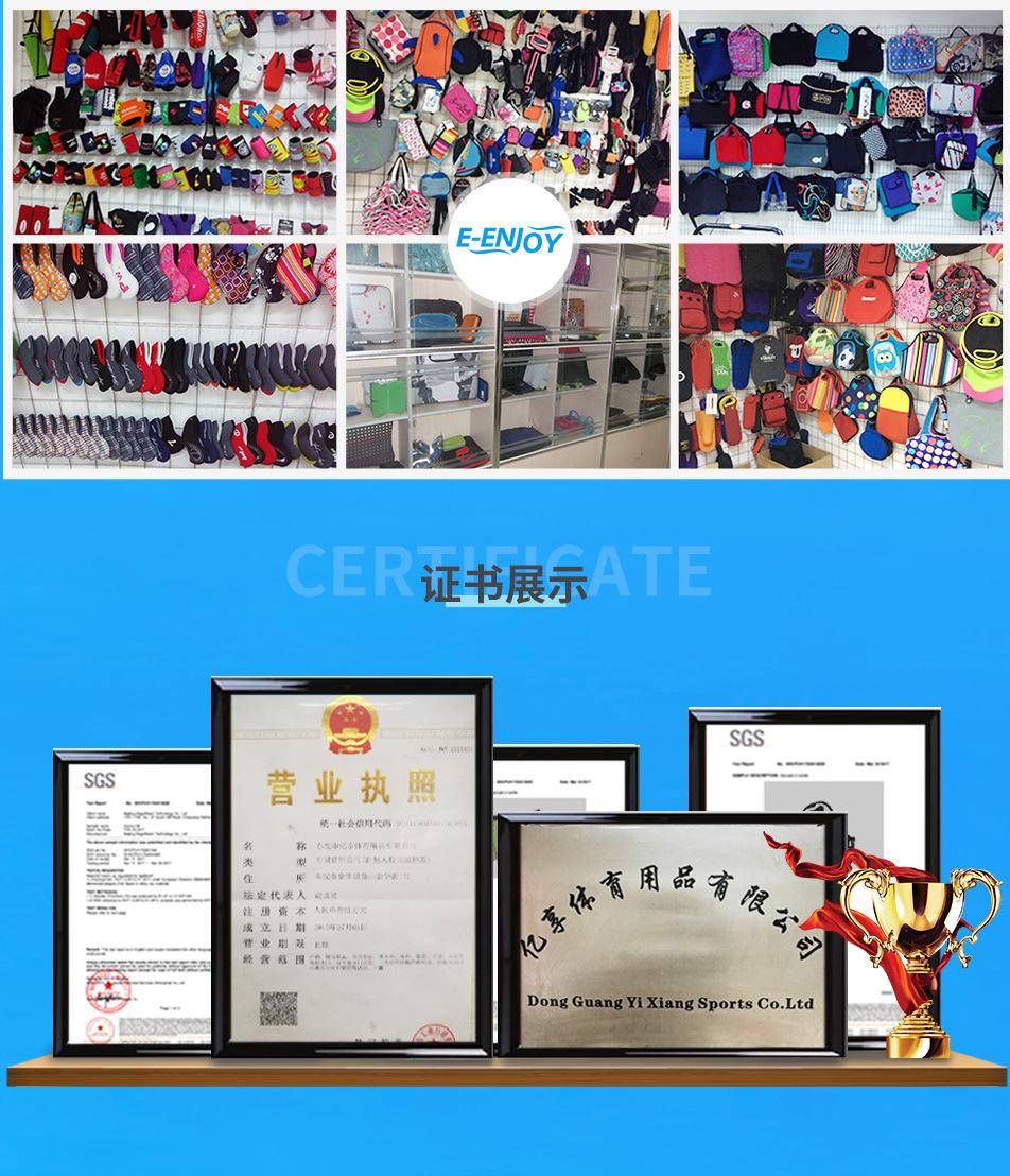 Yixiang Sports Goods Co., Ltd. es una empresa independiente que integra servicios de producción, procesamiento y comercialización. Se dedica principalmente a productos de buceo, fundas para botellas, fundas para vasos, bolsas para ordenador, fundas aislantes para USB, fundas para iPad, fundas para cámaras, fundas para CD, fundas para teléfonos móviles, fundas para palos de golf, bolsas para comida, bolsas de viaje, bolsas para gafas, bolsas para cosméticos, etc. Es una empresa autorizada y registrada por los departamentos correspondientes. Gracias a nuestra sólida trayectoria, precios razonables y un excelente servicio, hemos forjado relaciones de cooperación a largo plazo con numerosas empresas.