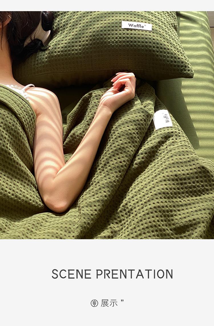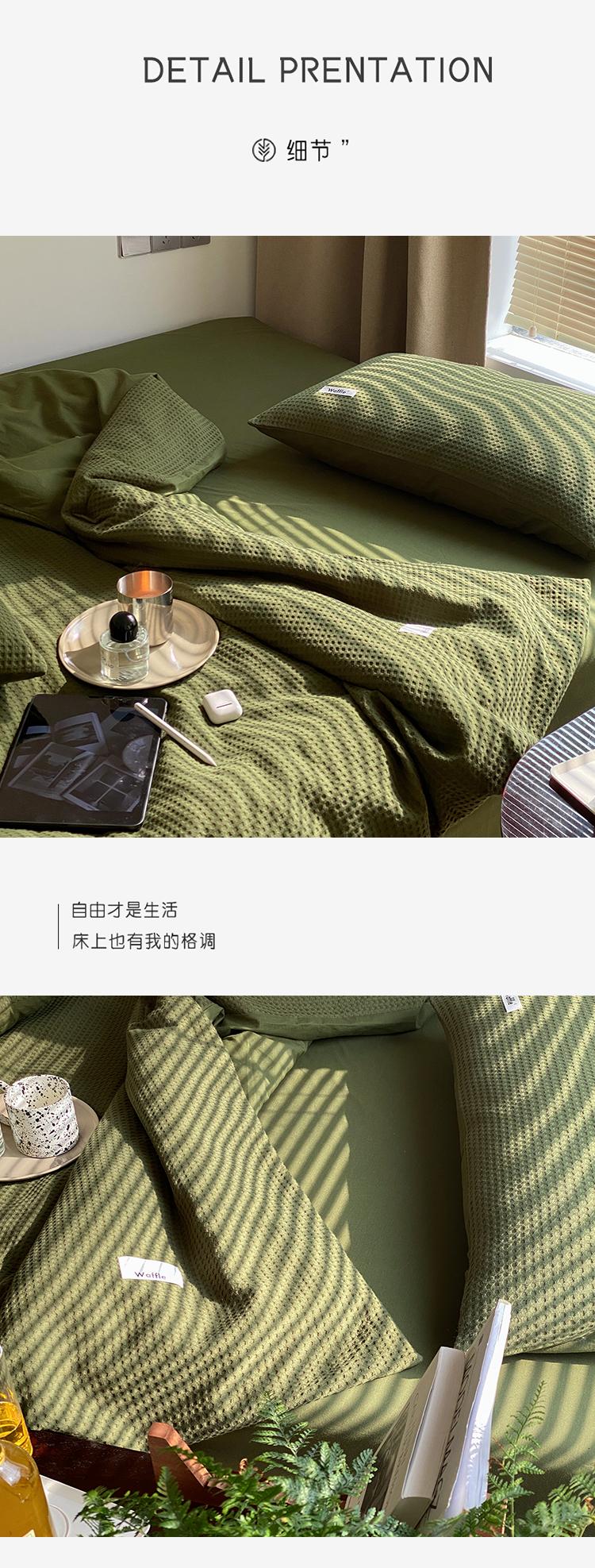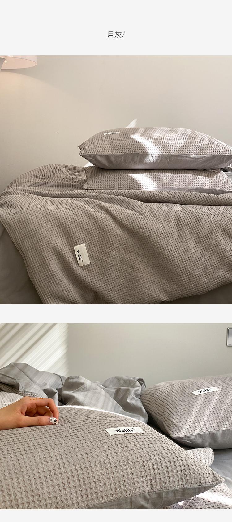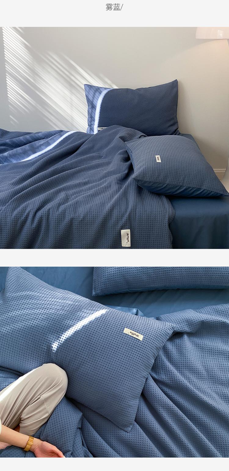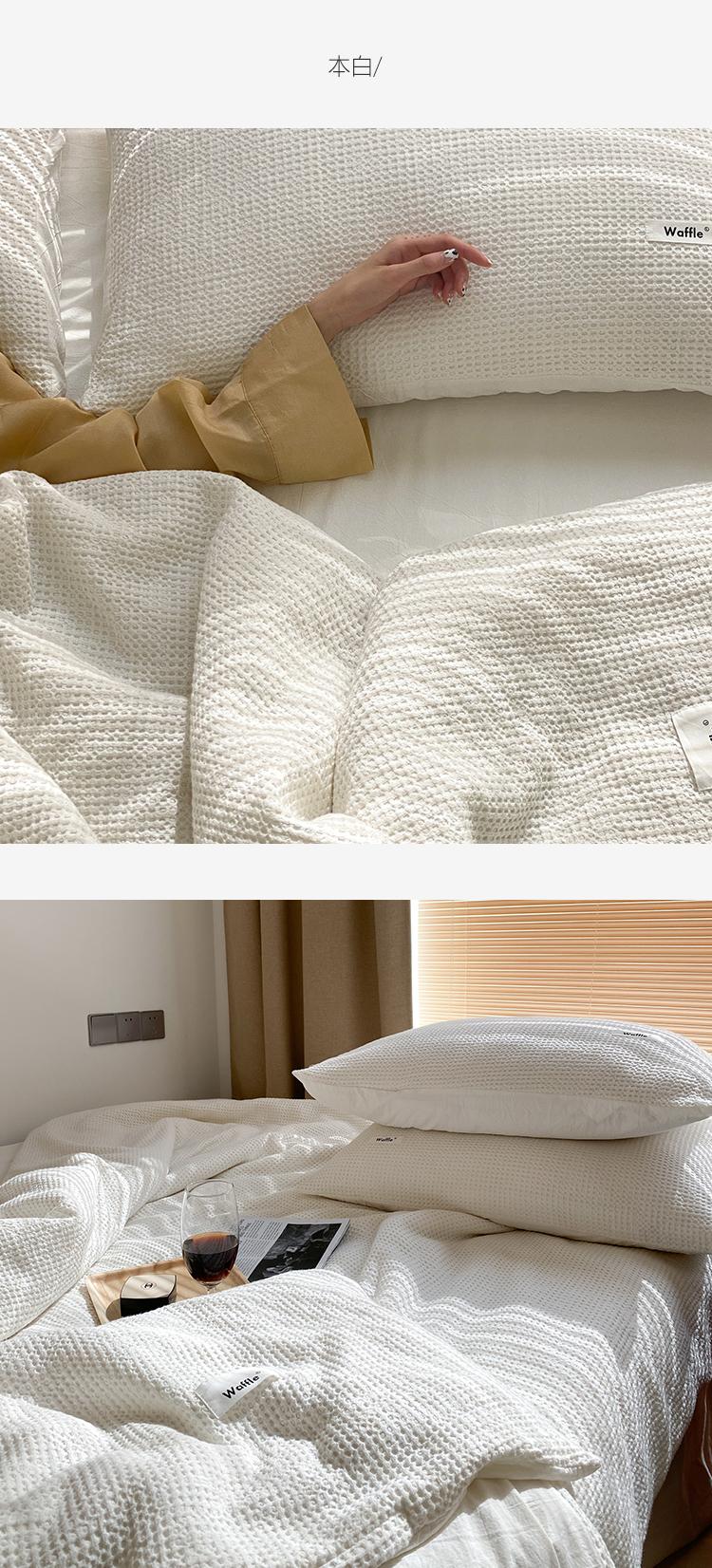 Esta ropa de cama tiene dos lados, A y B. El lado A está hecho de material waffle, que es absorbente del sudor y transpirable, ligeramente áspero, y de alta densidad y engrosado; el lado B es ajustado, hecho de algodón lavado de 40 hilos, cómodo y suave, con un tacto delicado. ¡Todo el juego de ropa de cama tiene una confección exquisita y costuras finas!