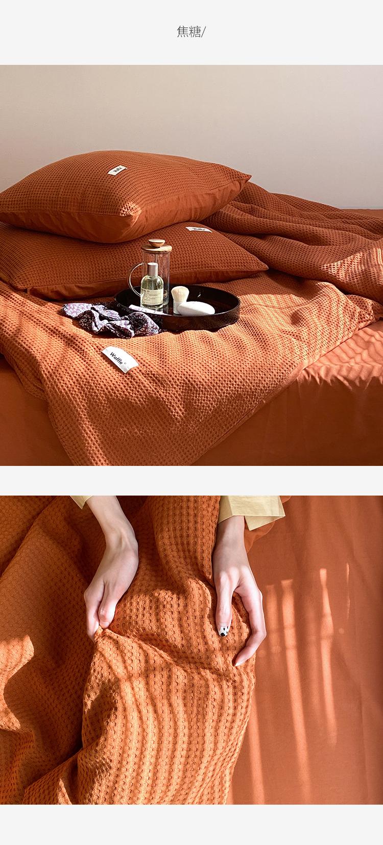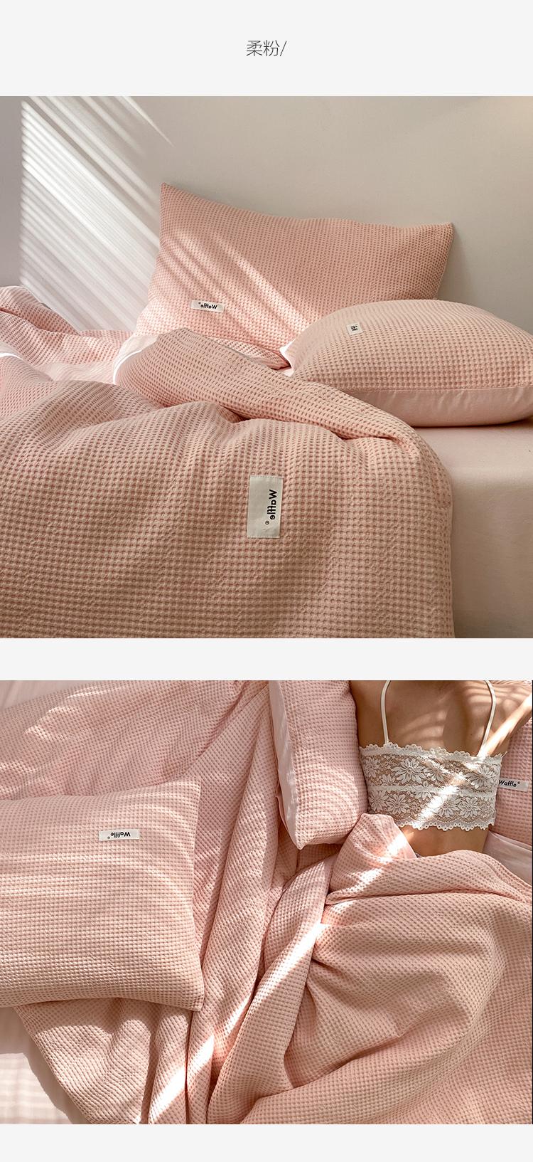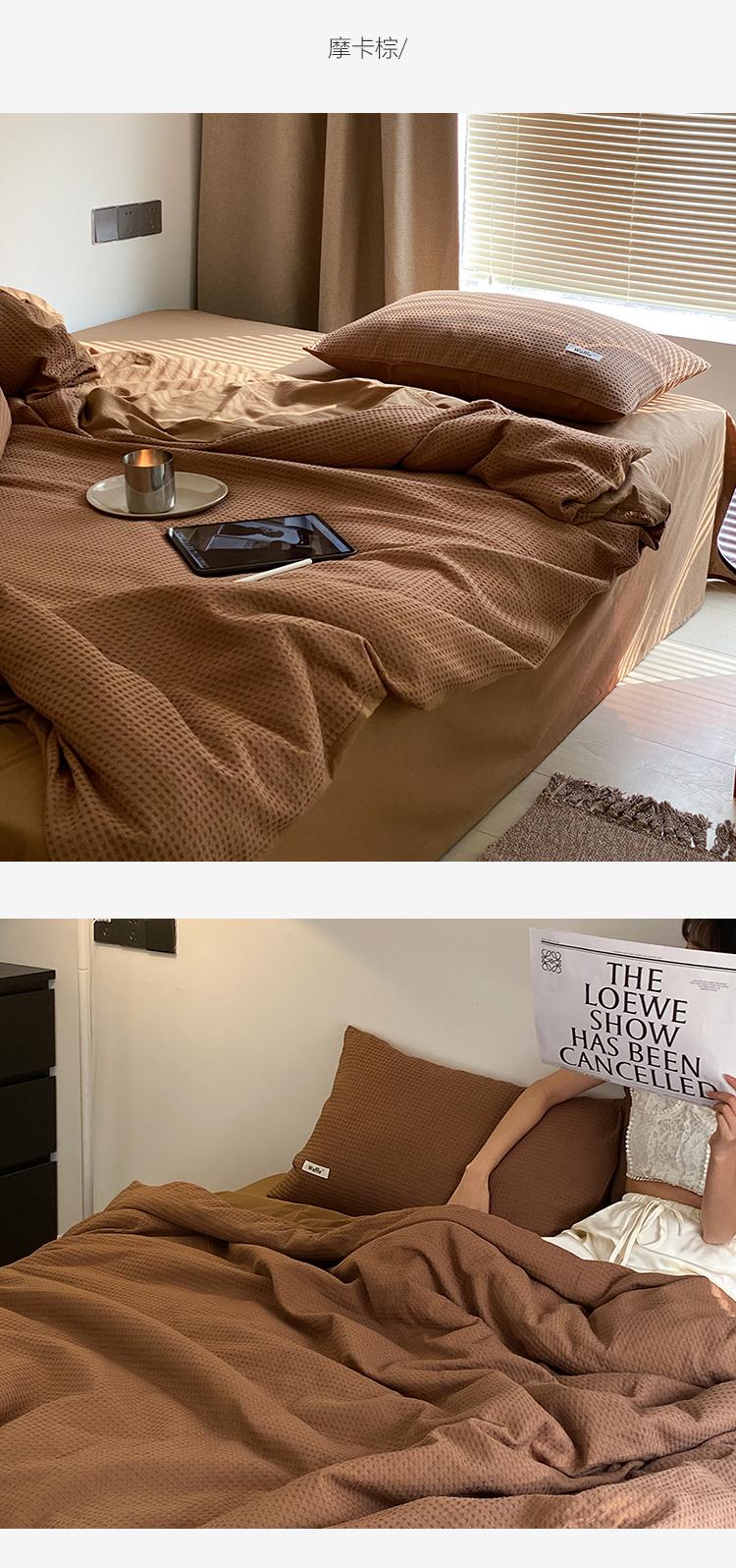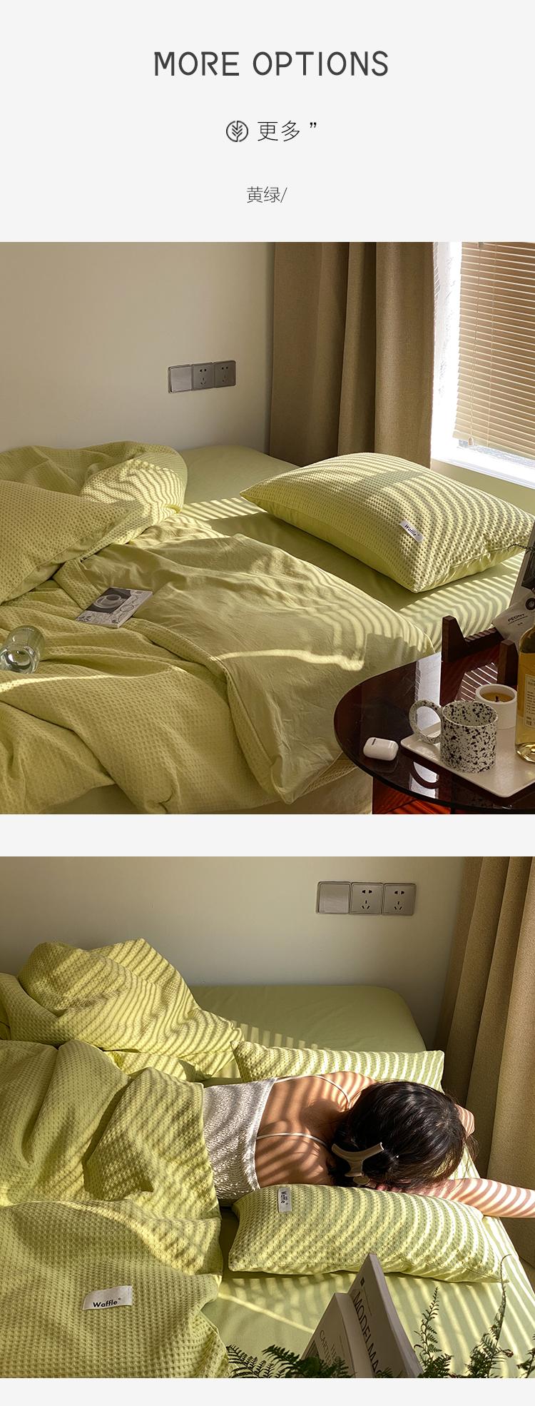 Esta ropa de cama tiene dos lados, A y B. El lado A está hecho de material waffle, que es absorbente del sudor y transpirable, ligeramente áspero, y de alta densidad y engrosado; el lado B es ajustado, hecho de algodón lavado de 40 hilos, cómodo y suave, con un tacto delicado. ¡Todo el juego de ropa de cama tiene una confección exquisita y costuras finas!