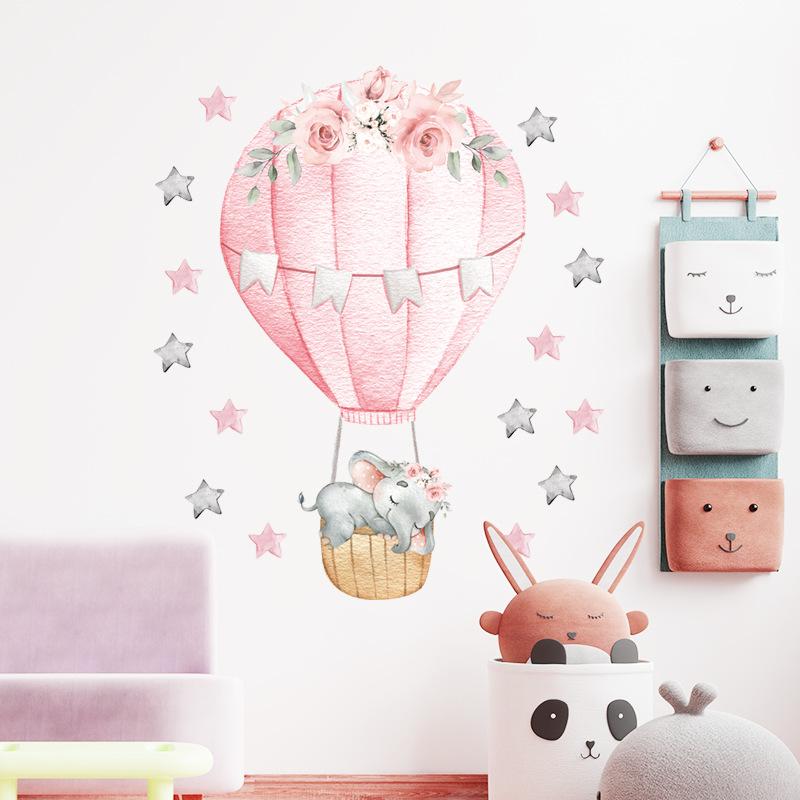 Br93095 Globo Aerostático Estrella Rosa Lindo Elefantito Adhesivo de Pared Autoadhesivo Adhesivo Decoración para el Hogar Habitación Infantil