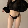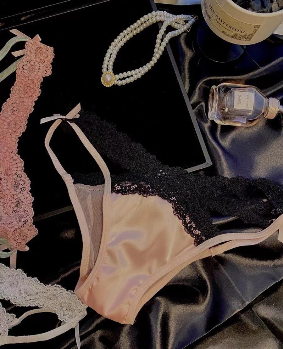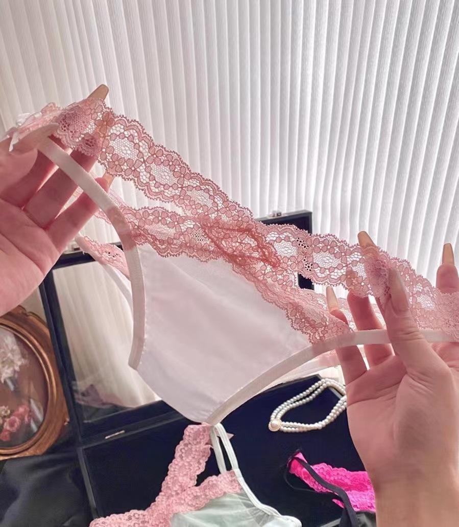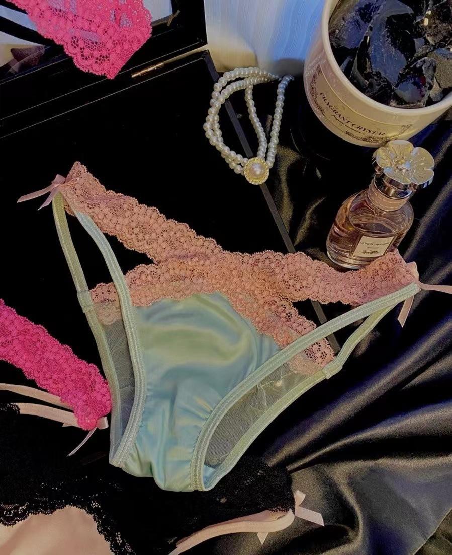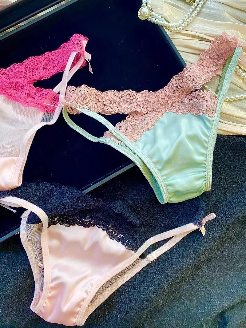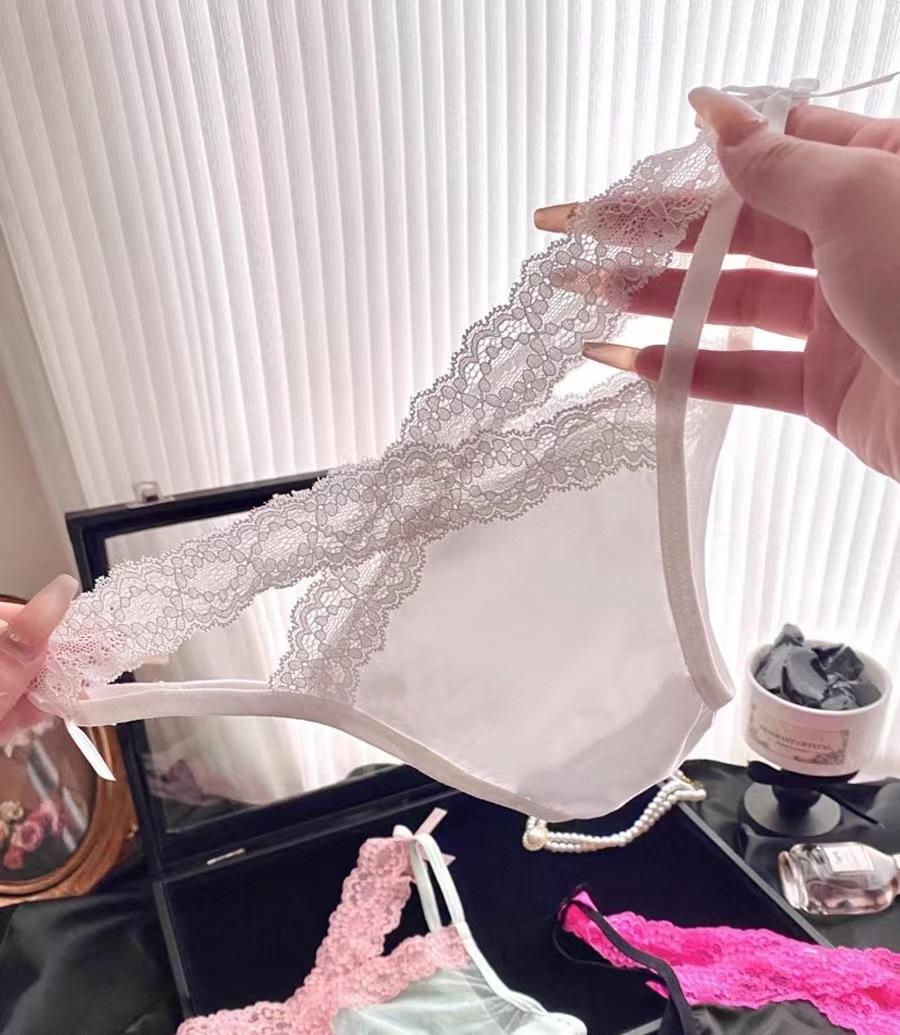 Temporada de combinación de colores sexy encaje puro chica caliente tentación cruzada calzones de malla con lazo de cintura baja para mujer