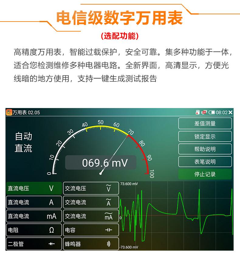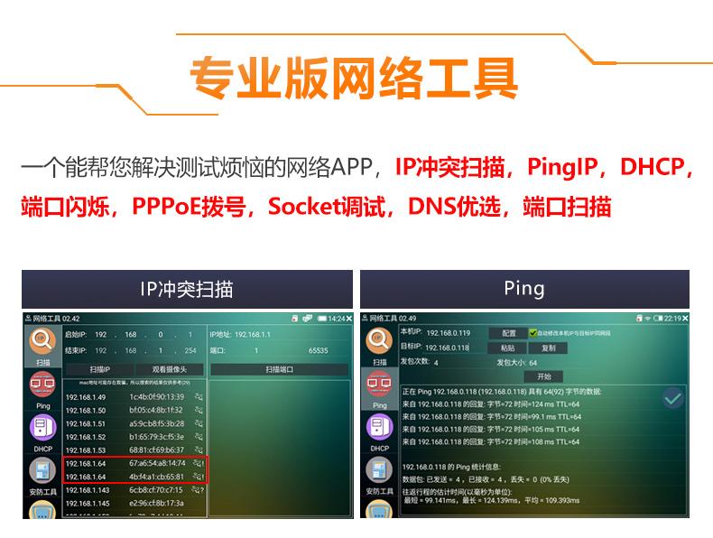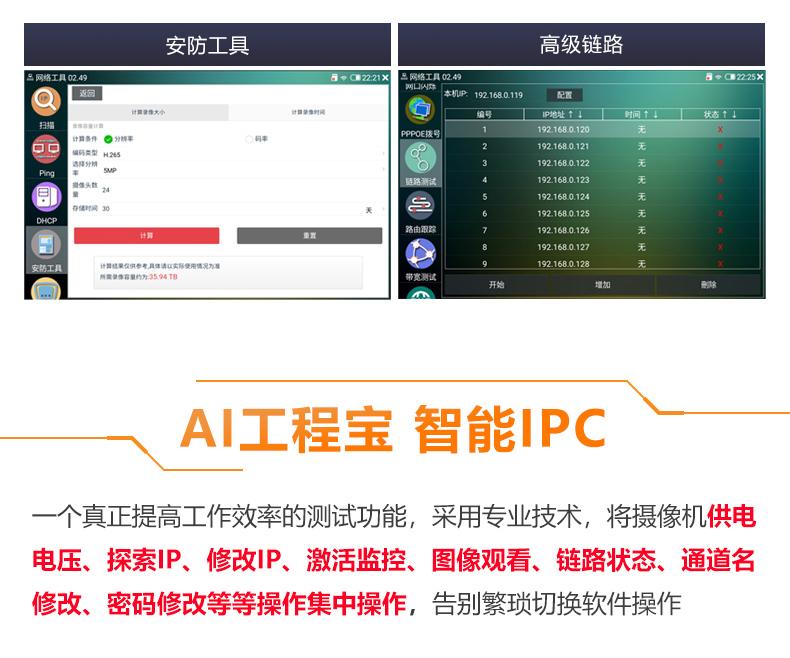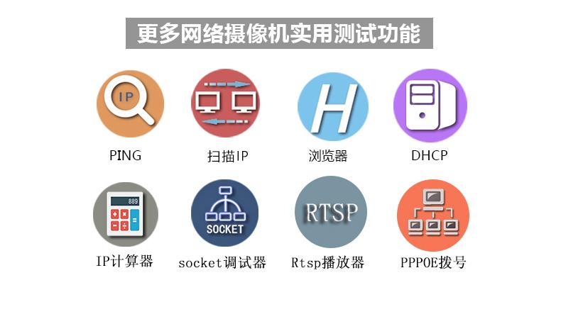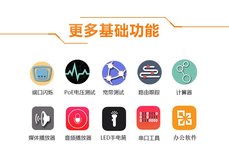 ● Herramientas de integración de red, escaneo de direcciones IP, PING, servicio DHCP, herramientas de seguridad comunes, parpadeo de puertos de red, prueba de función de marcación PPPoE, prueba de enlace avanzada, seguimiento de ruta, prueba de ancho de banda, depurador de sockets
