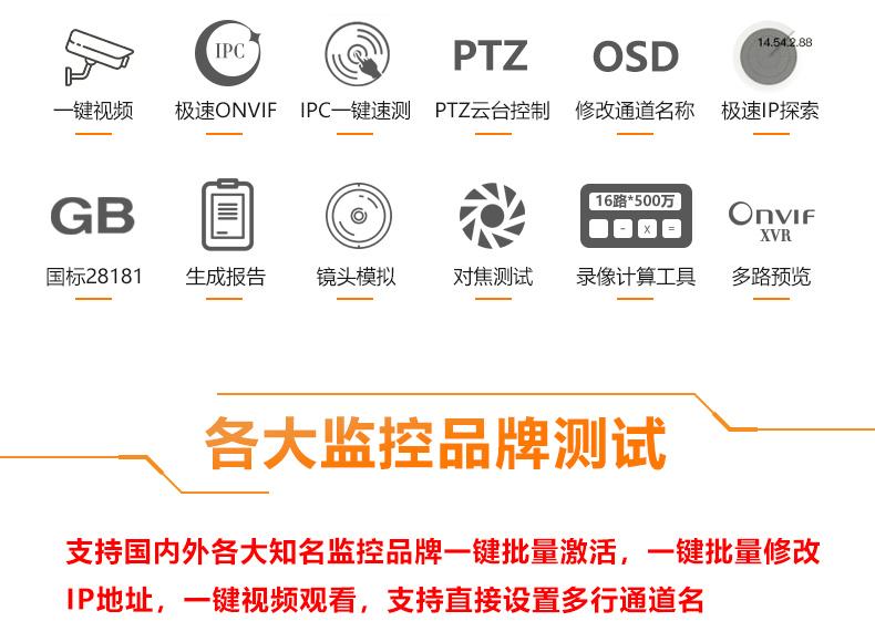 ● Soporta pruebas de protocolo privado IPC de más de 80 fabricantes de cámaras de red, incluyendo Dahua, Hikvision, ACTi, Samsung, etc.;