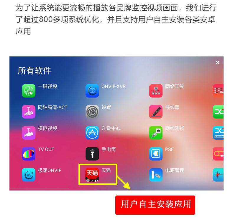 ● Un sistema completamente nuevo que le permite instalar y ejecutar el software cliente móvil del fabricante de la IPC en su teléfono o tableta, o instalar QQ, WeChat u otras aplicaciones en formato APK;