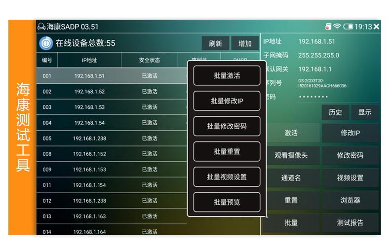 ● La nueva herramienta de prueba de Hikvision admite activación por lotes, modificación por lotes de IP, modificación de nombre de usuario y contraseña y otros parámetros, y agrega modificación personalizada de nombres de canal. La hora de la cámara se puede mostrar en una posición personalizada, lo cual es más conveniente. Se pueden restaurar los ajustes de fábrica, etc.