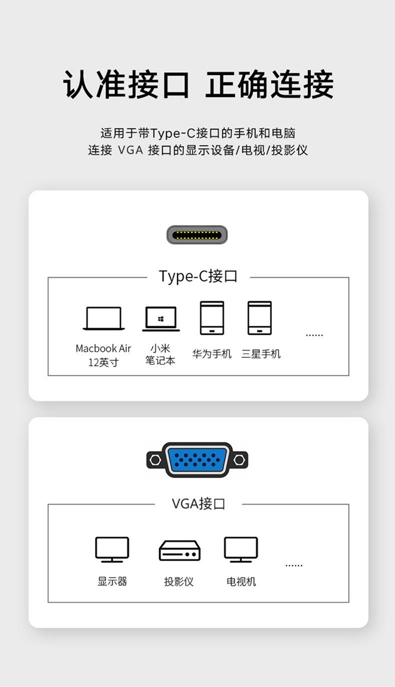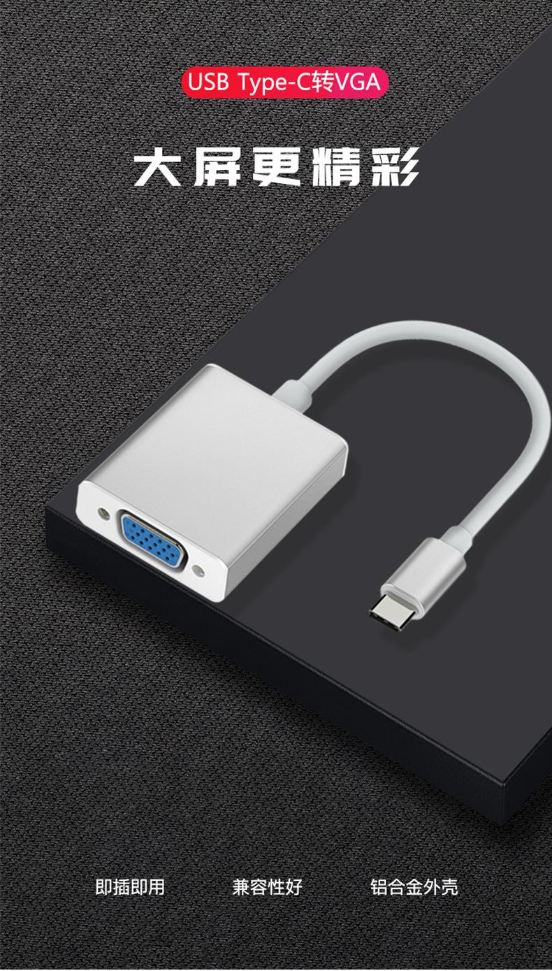 Convertidor de tipo C a VGA HD, chip 1080P, cable para monitor de portátil, venta al por mayor