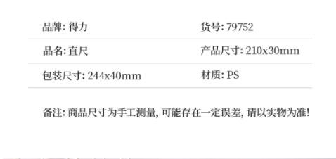 Nombre del Producto: Regla (20cm)Marca: DeliNúmero de producto: 79752Embalaje del producto: 40 piezas/caja mediana 1200 piezas/pieza