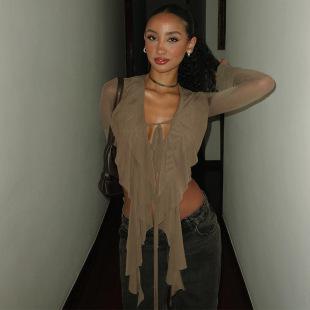Ropa de Mujer Transfronteriza Europea y Americana 2025 Invierno Amazon Nuevo Cuello en V Malla con Volantes Sexy Cárdigan Top de Manga Larga