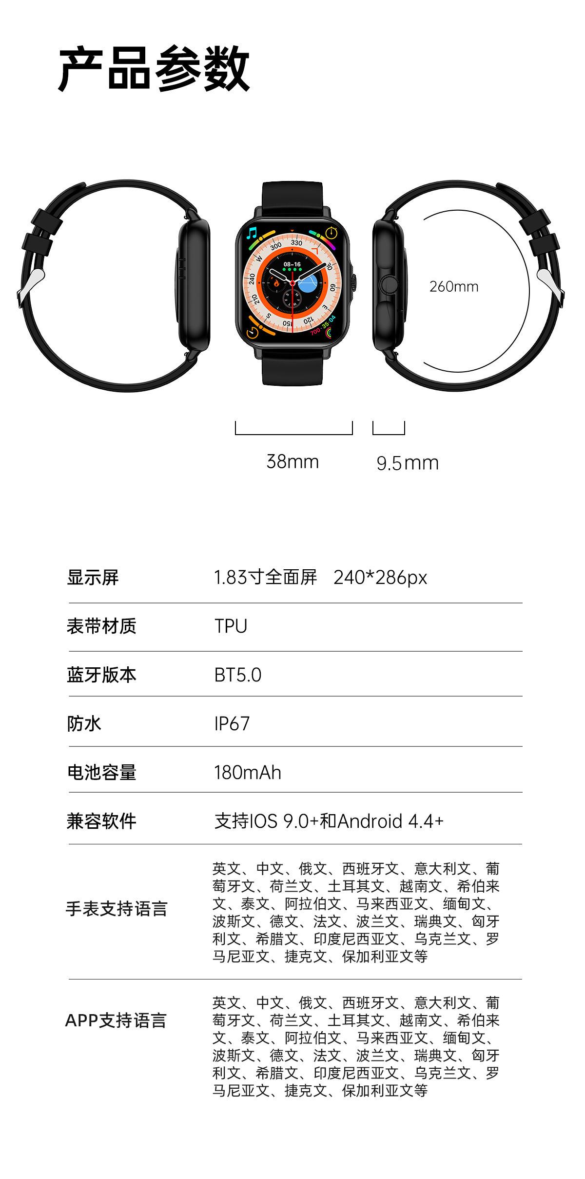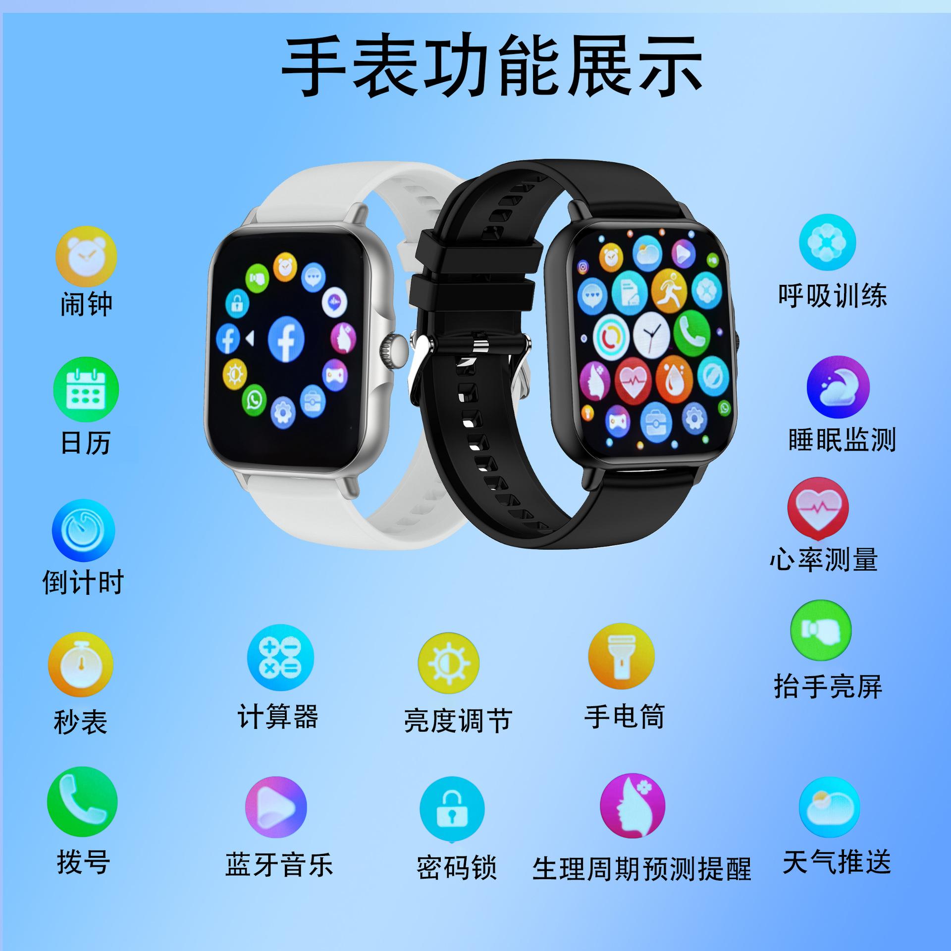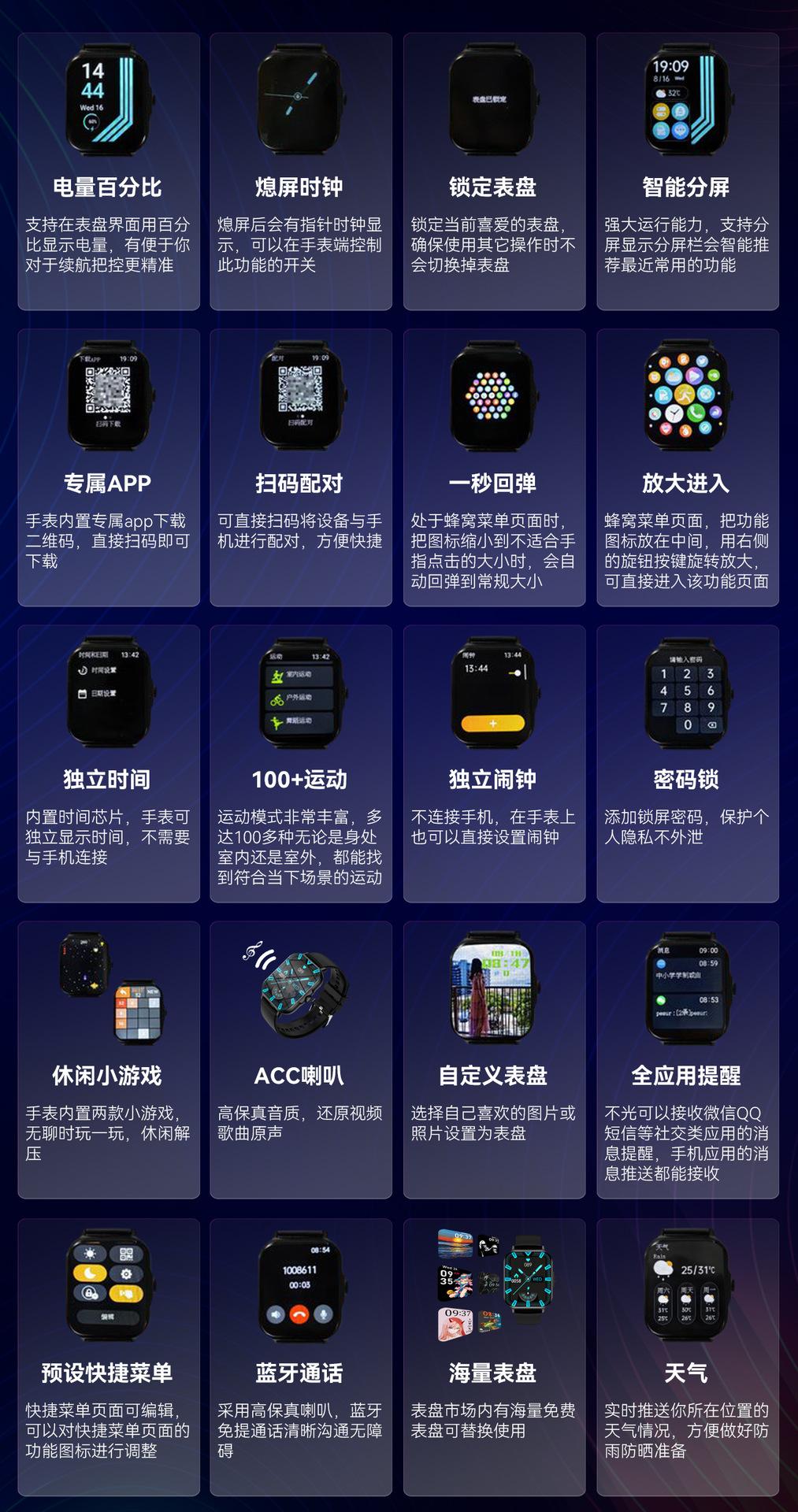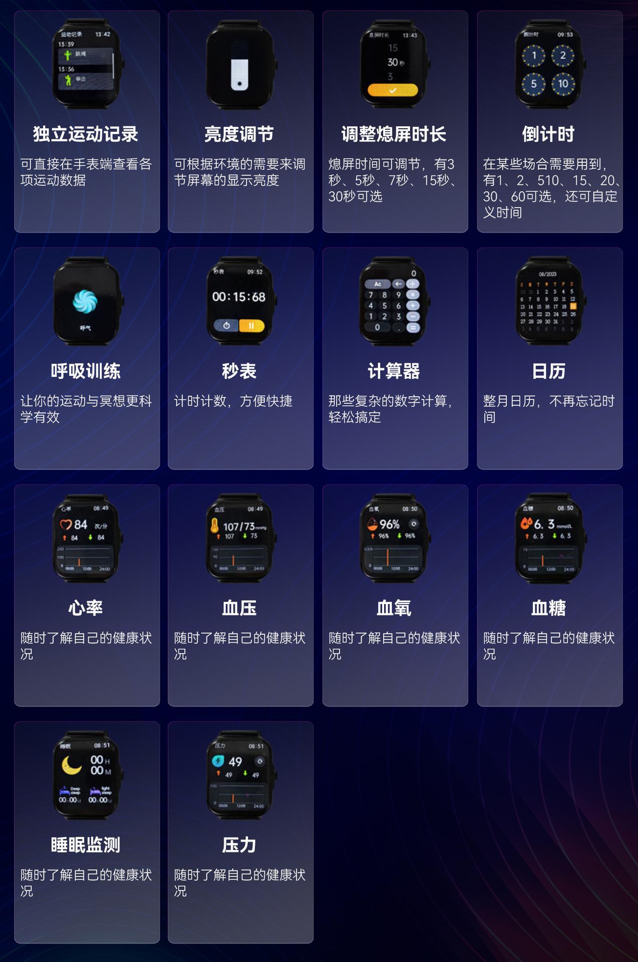 Step counting, Heart rate monitoring, Blood pressure measurement, Social entertainment, Bluetooth call, Smart ...