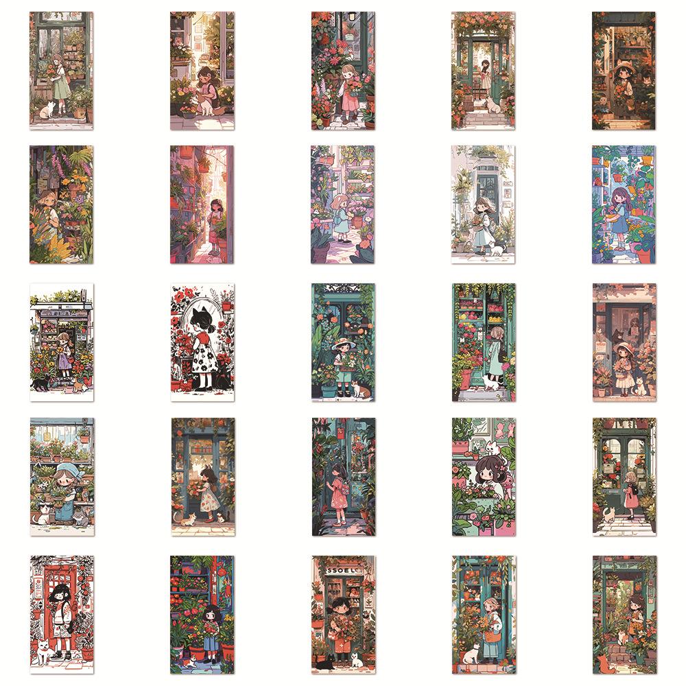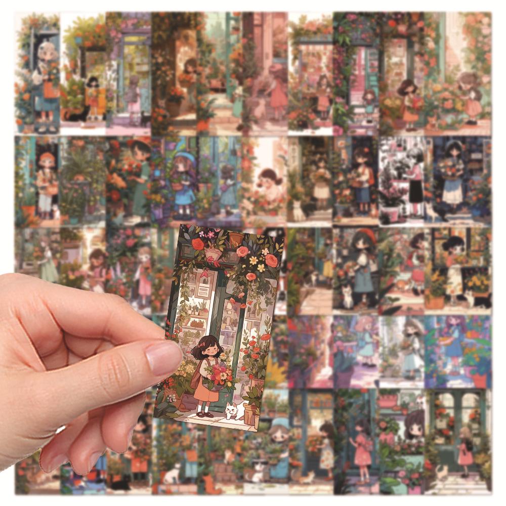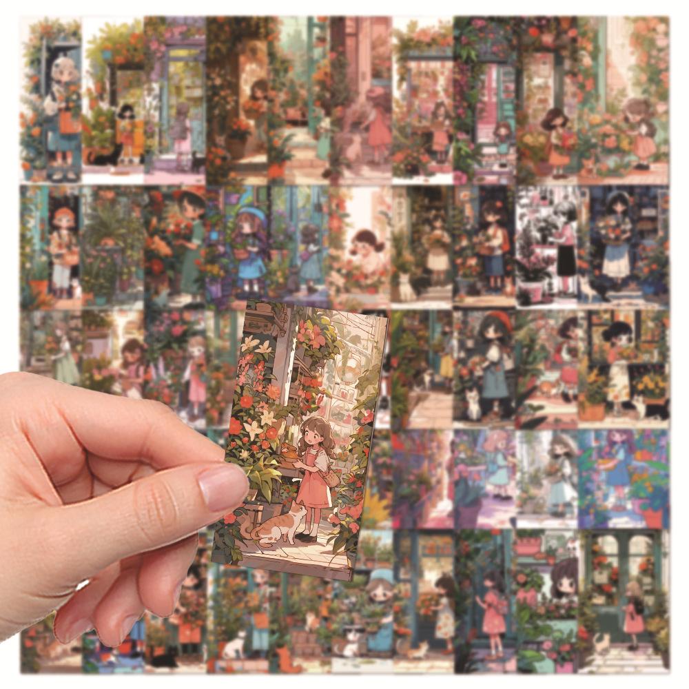 50 pegatinas de niña y maullido en una floristería fresca, lindas pegatinas decorativas para fundas de teléfono con dibujos animados y cuentas de mano.