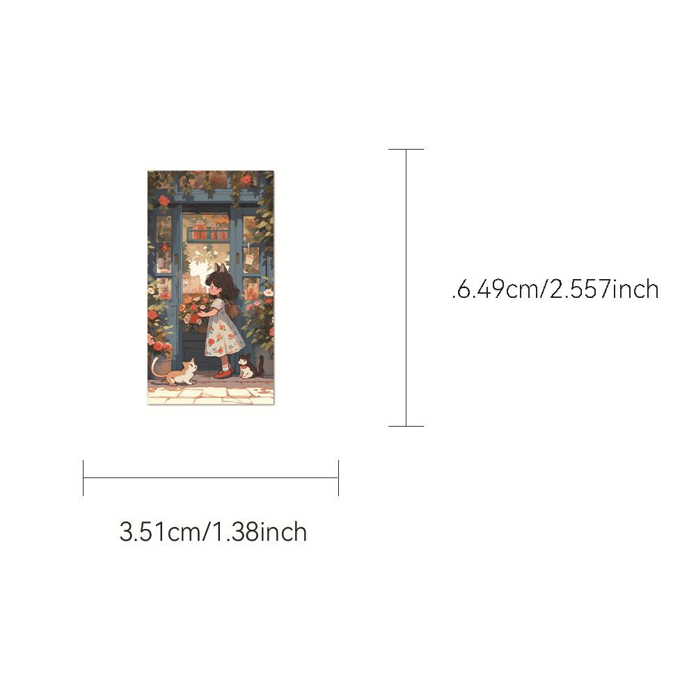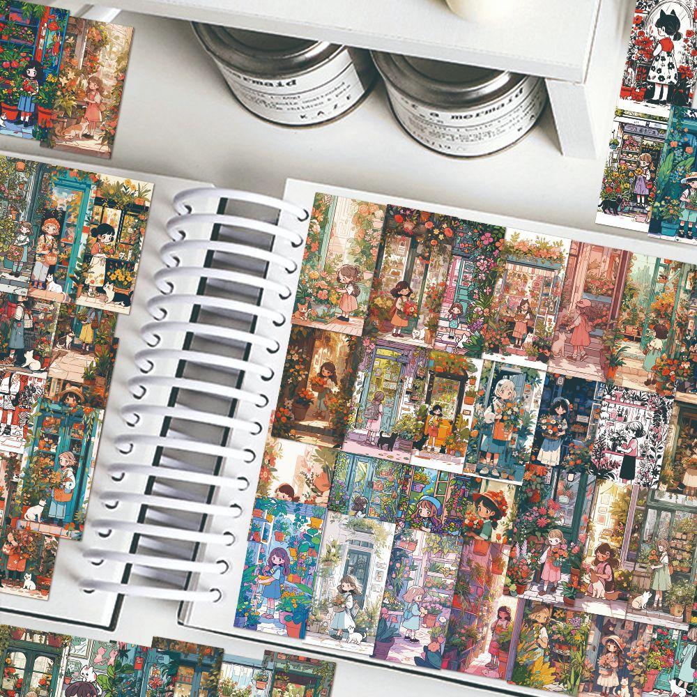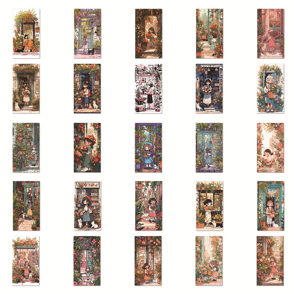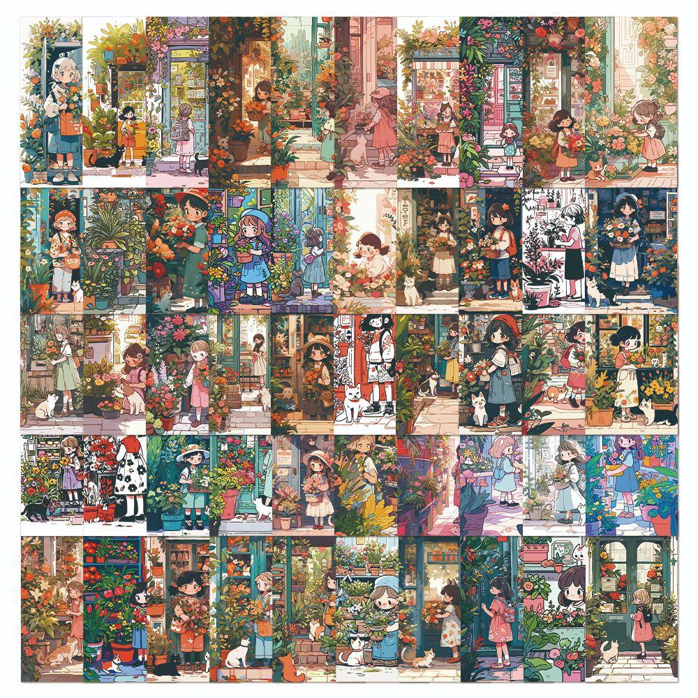 50 pegatinas de niña y maullido en una floristería fresca, lindas pegatinas decorativas para fundas de teléfono con dibujos animados y cuentas de mano.